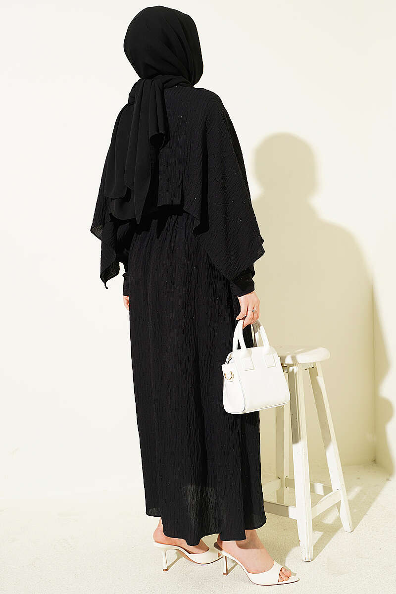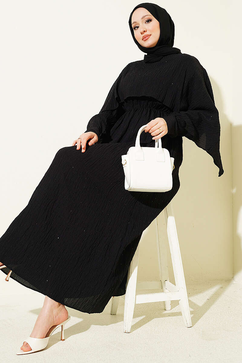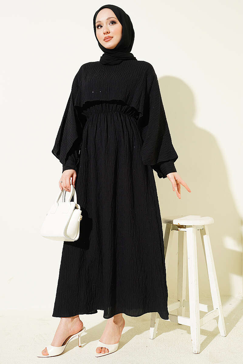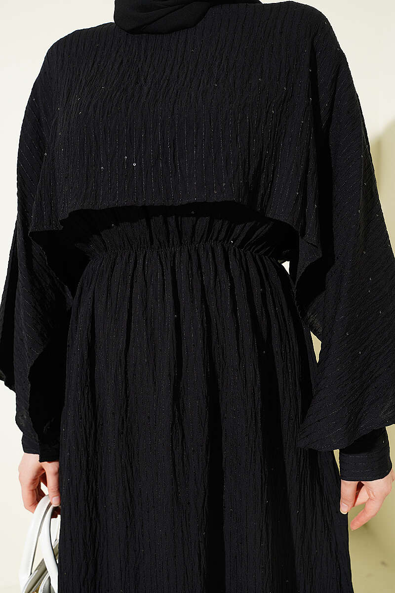 Çizgi Dikişli Bel Lastikli Pelerinli Elbise Siyah