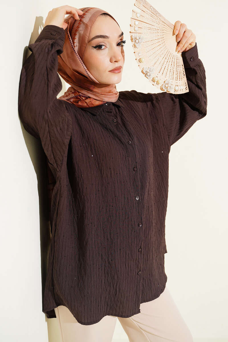 Kat Kat Detaylı Büzgülü Gömlek Kahve