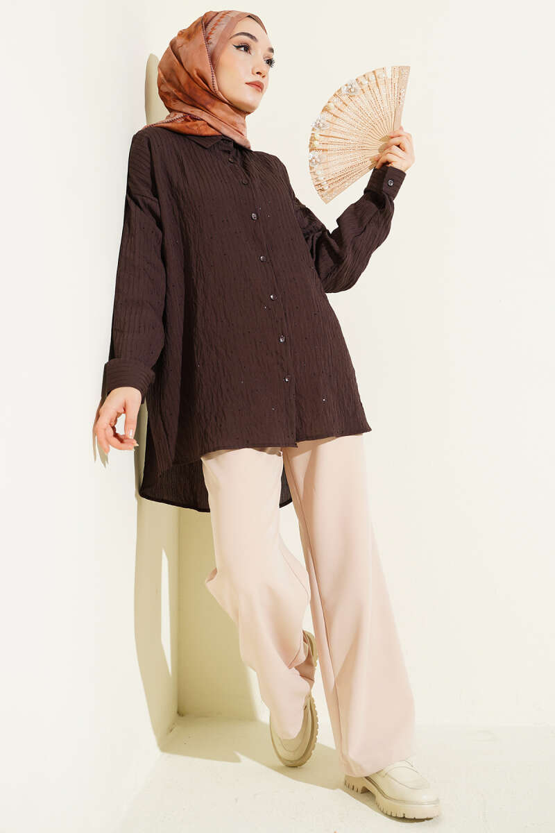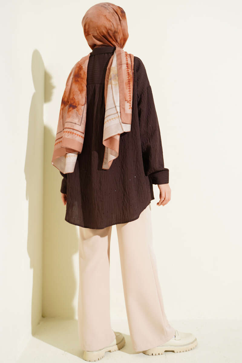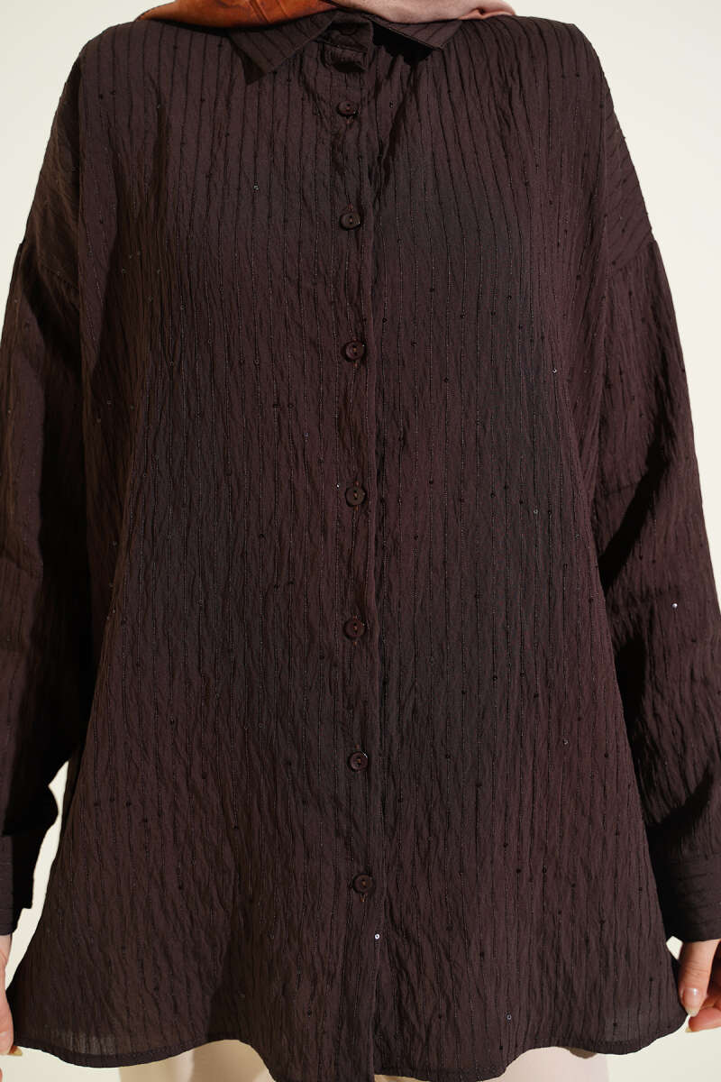 Çizgi Dikişli Pullu Oversize Gömlek Kahve