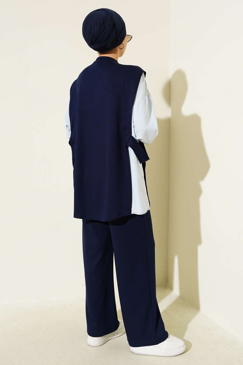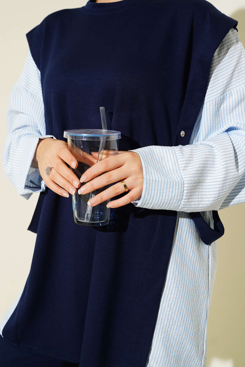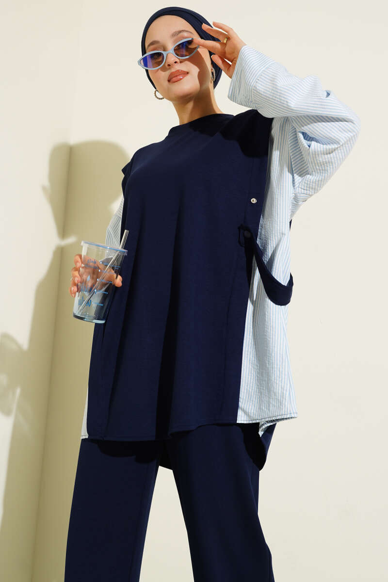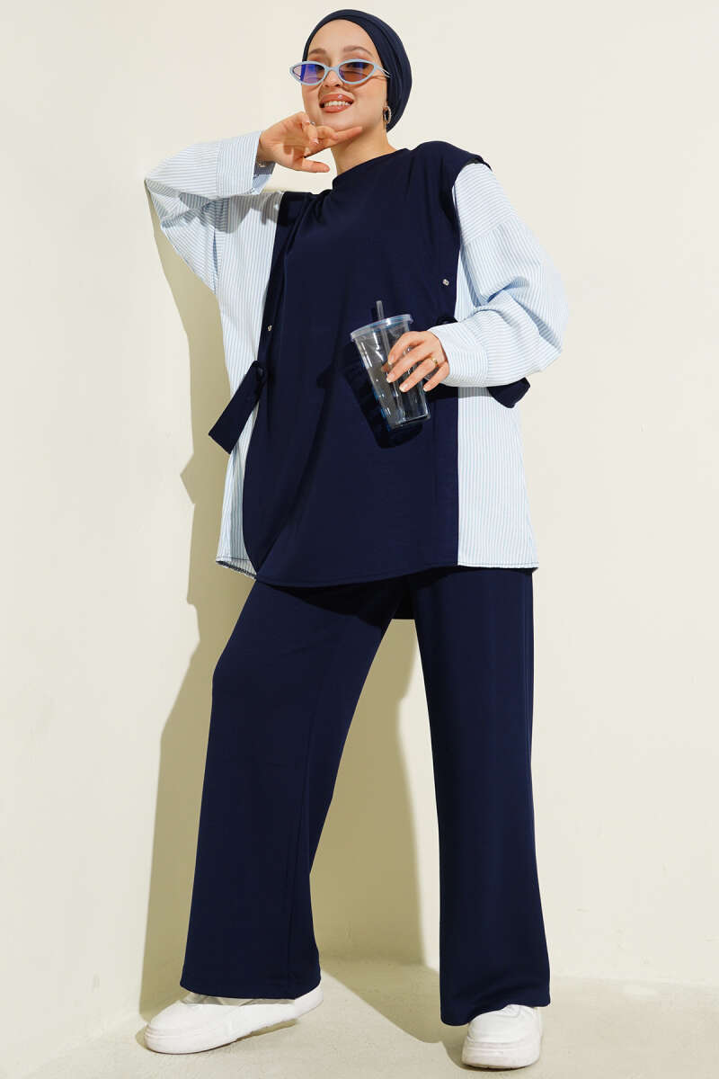 Çizgi Garnili Bisiklet Yaka Loyşa İkili Takım Lacivert