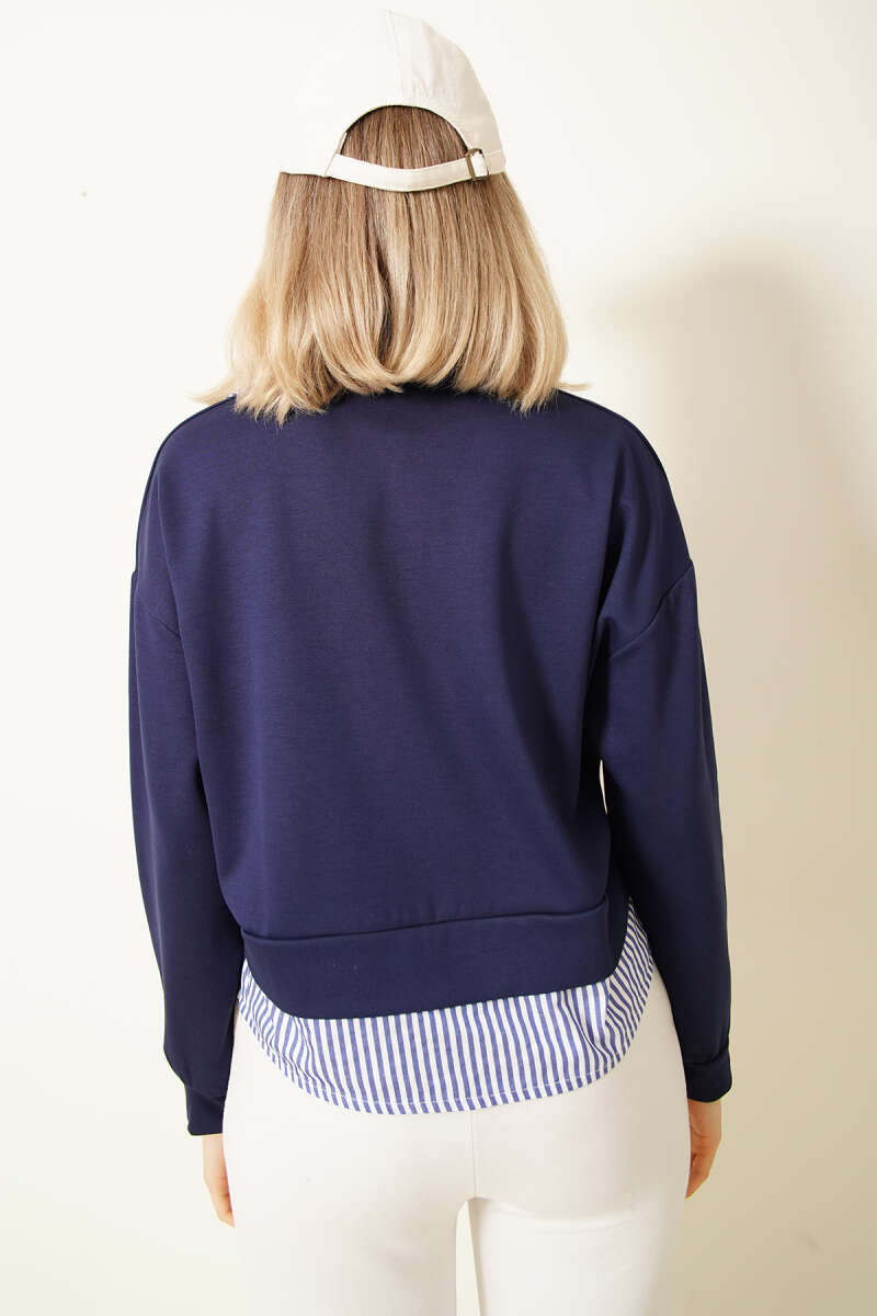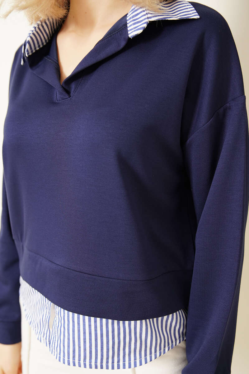 Çizgi Gömlek Garnili Kısa Sweatshirt Lacivert