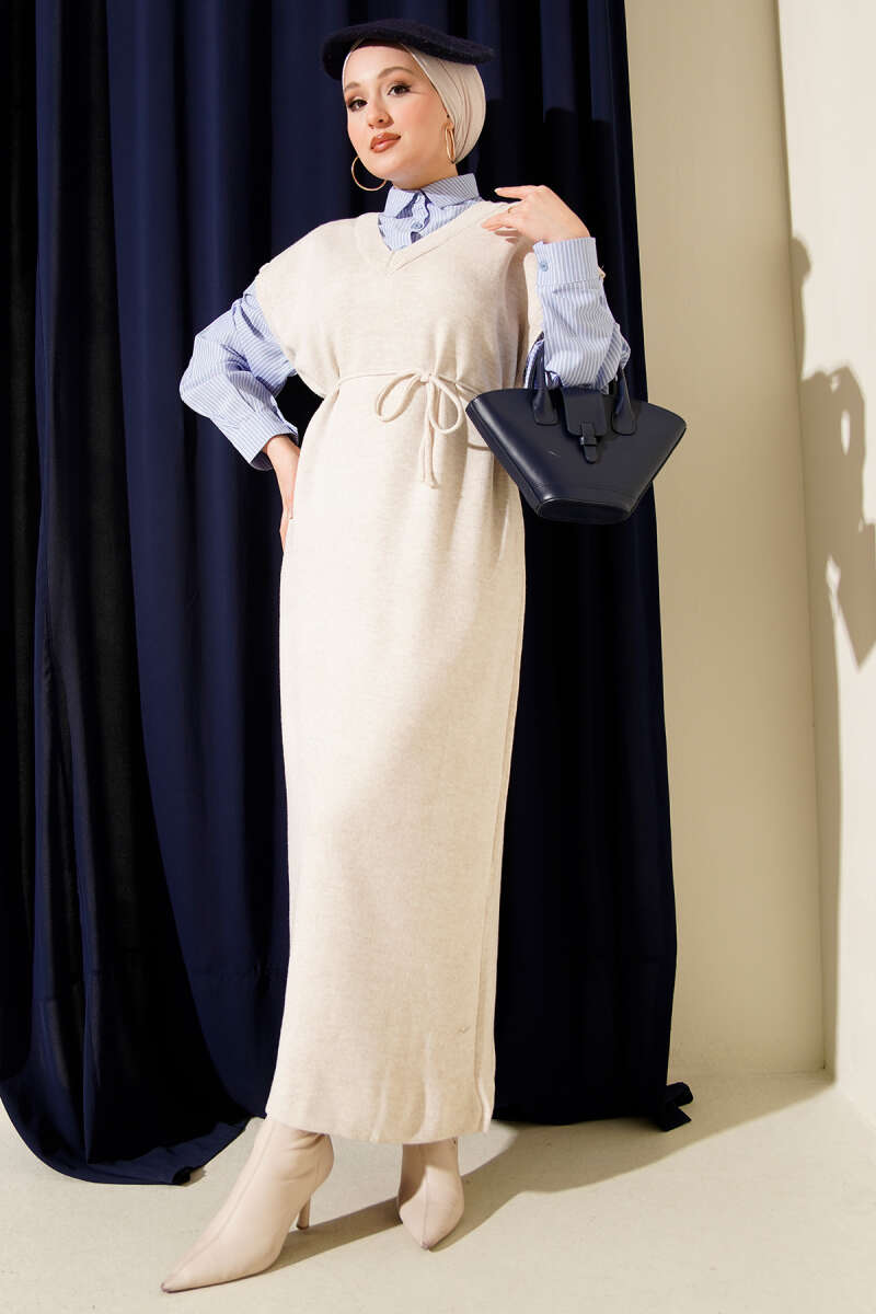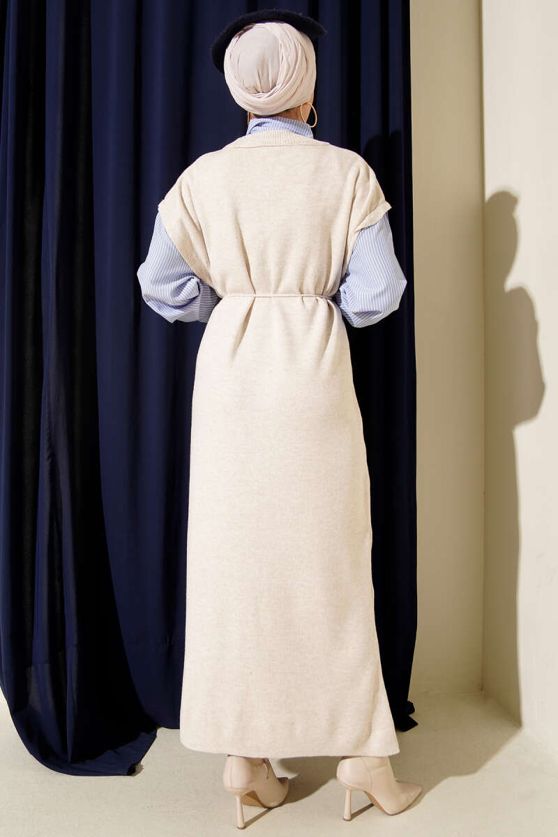 Çizgi Gömlek Garnili Triko Elbise Bej