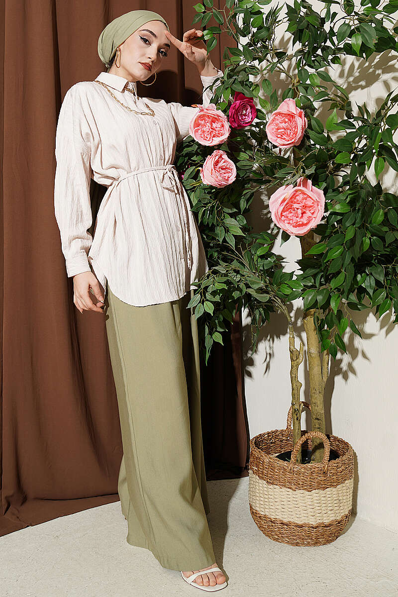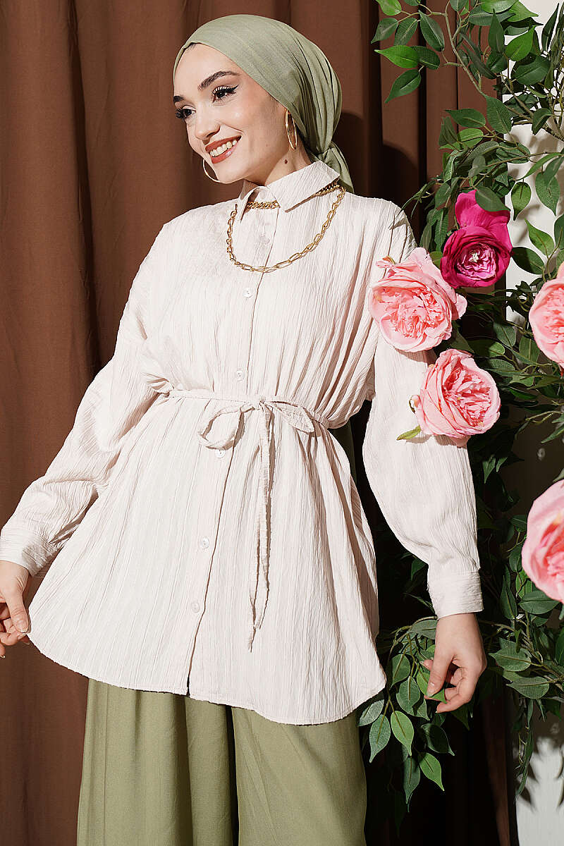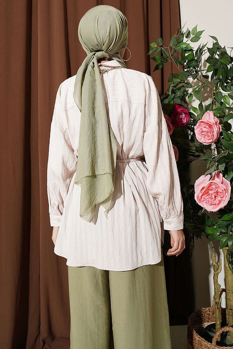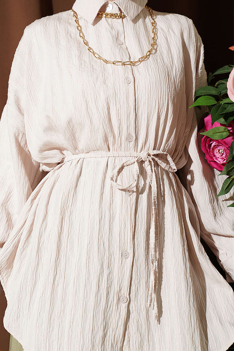 Bu gömlek, kumaşındaki çizgi kabartma dokusu sayesinde klasik tasarımlara modern ve dinamik bir boyut kazandıran oldukça şık bir parçadır. Bel kısmında yer alan ip kuşak detayı, dökümlü oversize kesimi zarifçe formlandırırken feminen bir silüet oluşturmanıza yardımcı olur. Hafif yapısı ve düşük omuz tasarımı ile gün boyu konfor sunan bu gömlek, hem spor hem de klasik kombinlerde çok yönlü bir kullanım imkanı sağlar. Yanlardaki oval kesim bitişleri ve dokulu yüzeyiyle, günlük stilinize zahmetsizce sofistike bir dokunuş eklemek için ideal bir tercihtir.