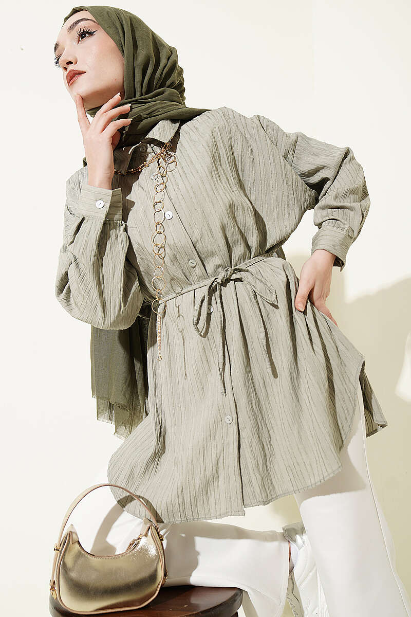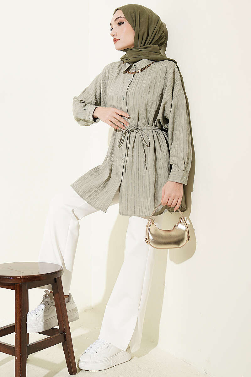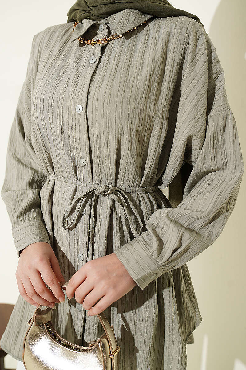 Çizgi Kabartmalı Oversize İp Kuşaklı Gömlek Çağla Yeşili