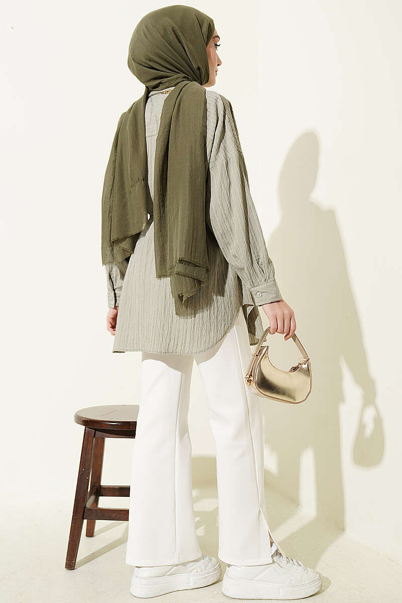 Bu gömlek, kumaşındaki çizgi kabartma dokusu sayesinde klasik tasarımlara modern ve dinamik bir boyut kazandıran oldukça şık bir parçadır. Bel kısmında yer alan ip kuşak detayı, dökümlü oversize kesimi zarifçe formlandırırken feminen bir silüet oluşturmanıza yardımcı olur. Hafif yapısı ve düşük omuz tasarımı ile gün boyu konfor sunan bu gömlek, hem spor hem de klasik kombinlerde çok yönlü bir kullanım imkanı sağlar. Yanlardaki oval kesim bitişleri ve dokulu yüzeyiyle, günlük stilinize zahmetsizce sofistike bir dokunuş eklemek için ideal bir tercihtir.