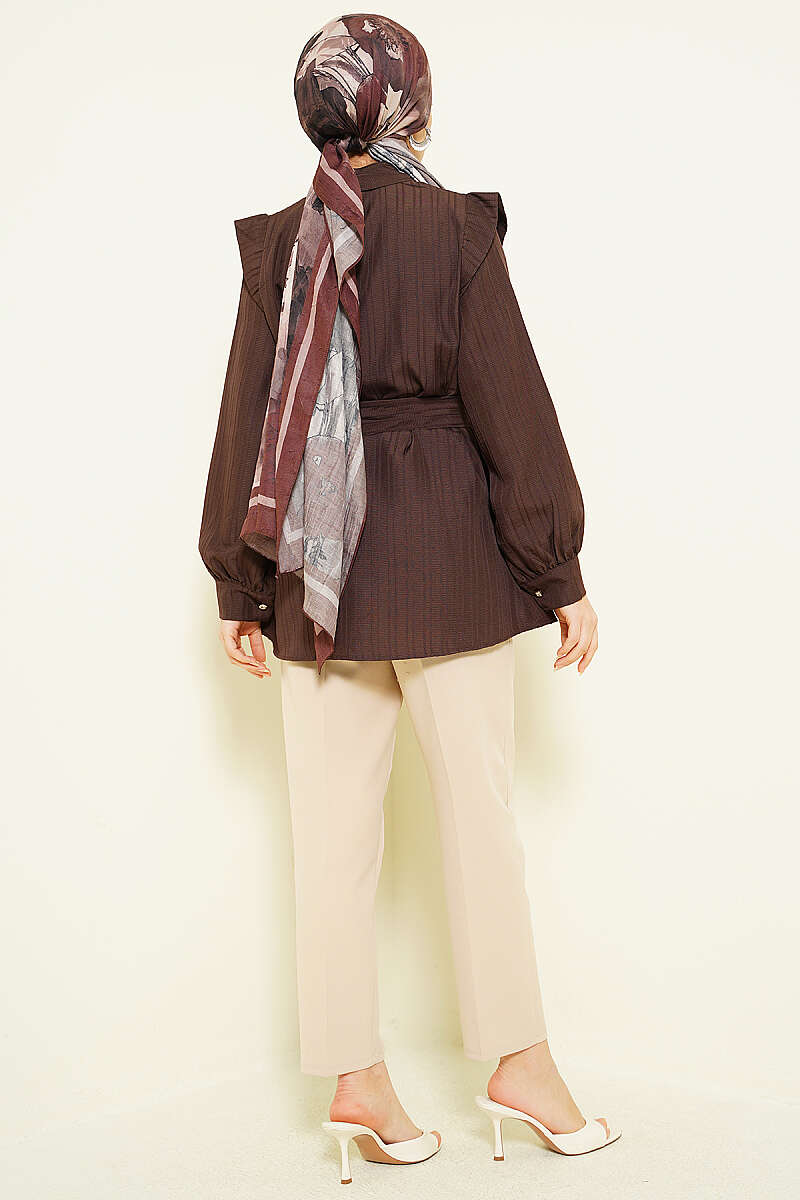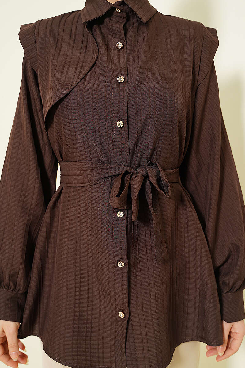 Çizgi Kabartmalı Taş Düğmeli Gömlek Kahve