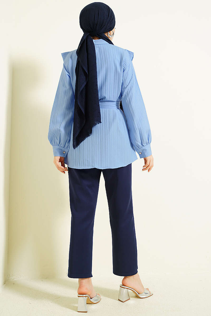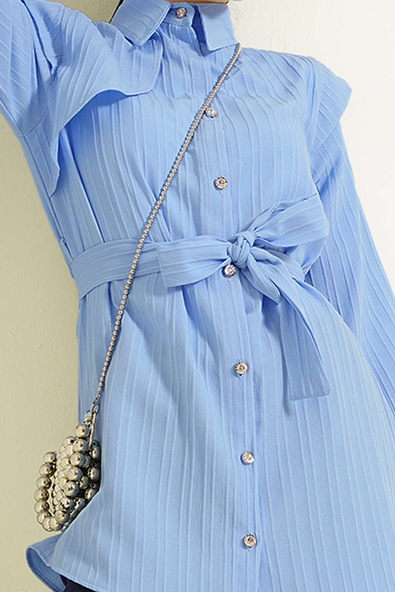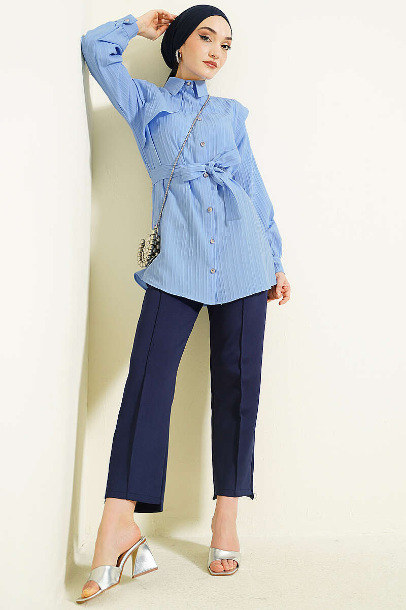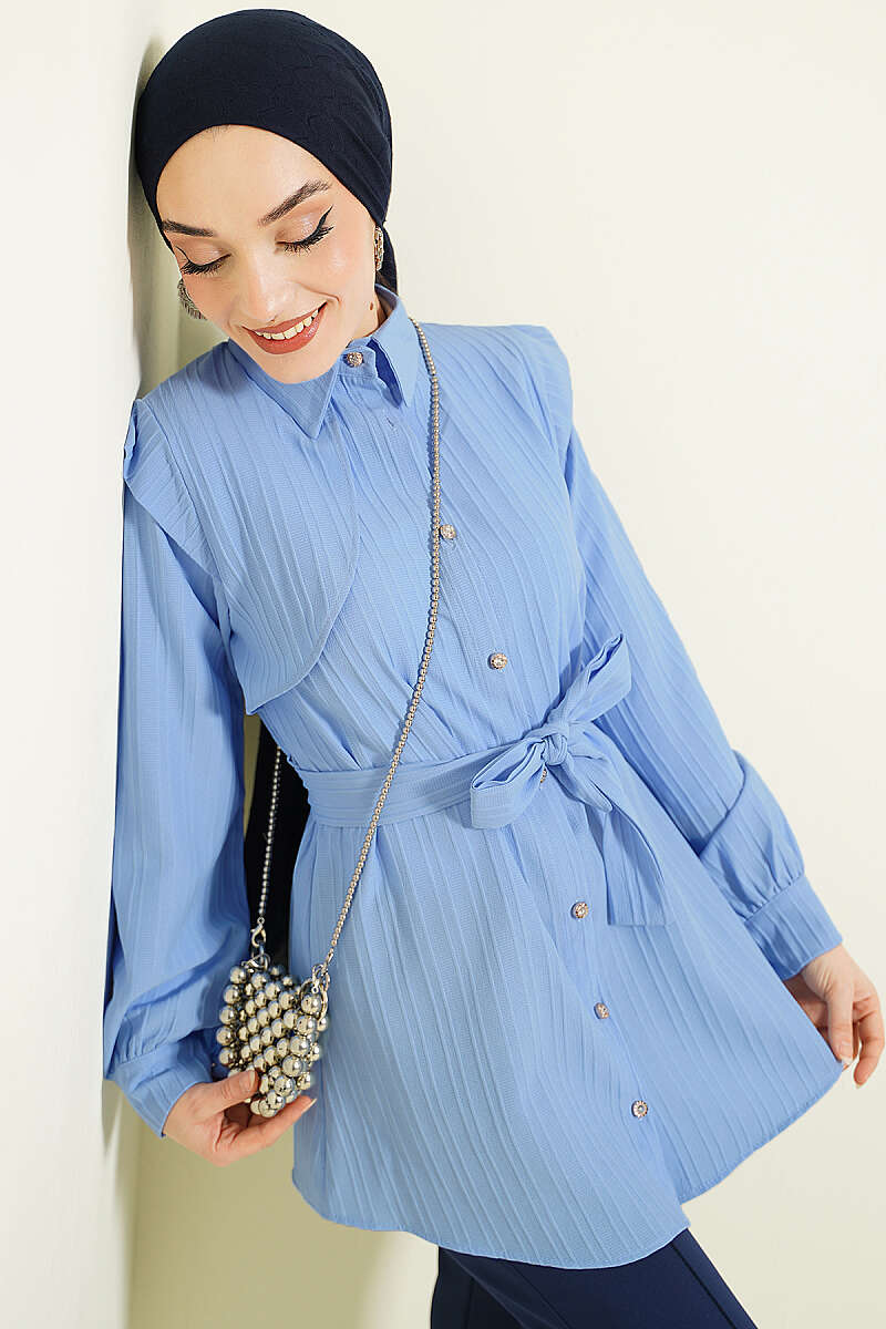 Çizgi Kabartmalı Taş Düğmeli Gömlek Mavi