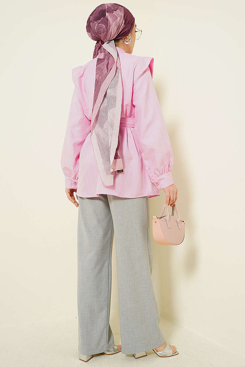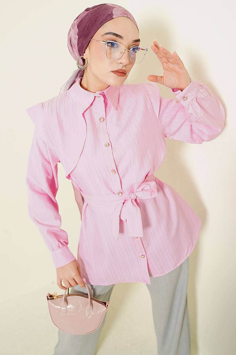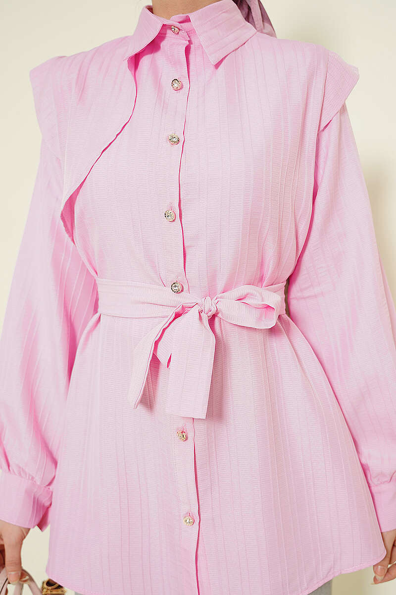Çizgi Kabartmalı Taş Düğmeli Gömlek Pembe