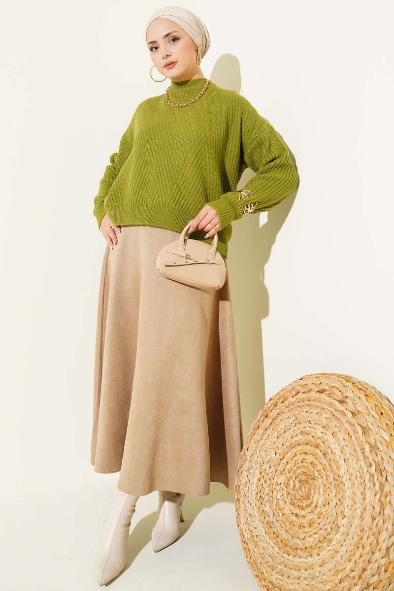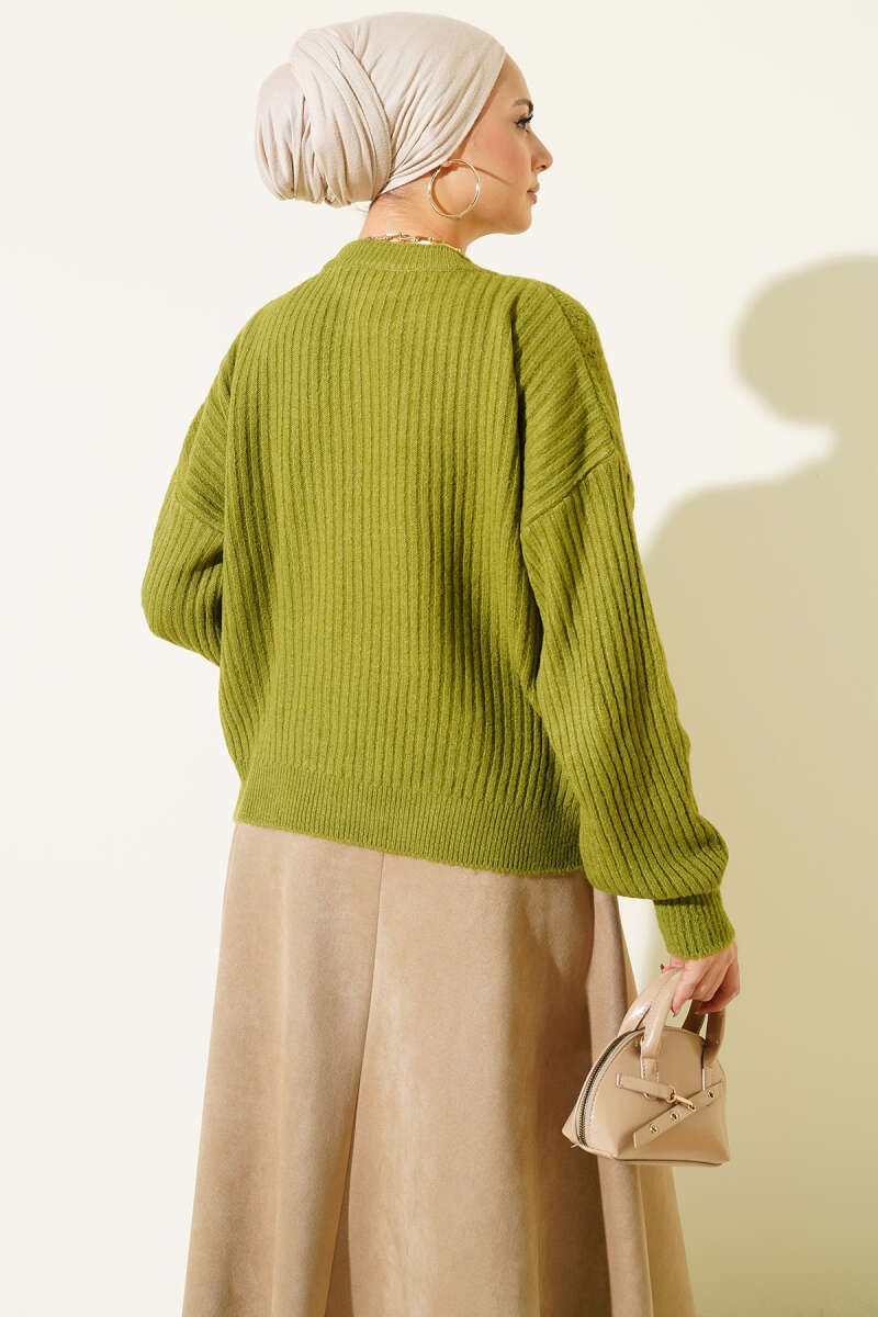 Çizgi Kabartmalı Triko Kazak Yağ Yeşili