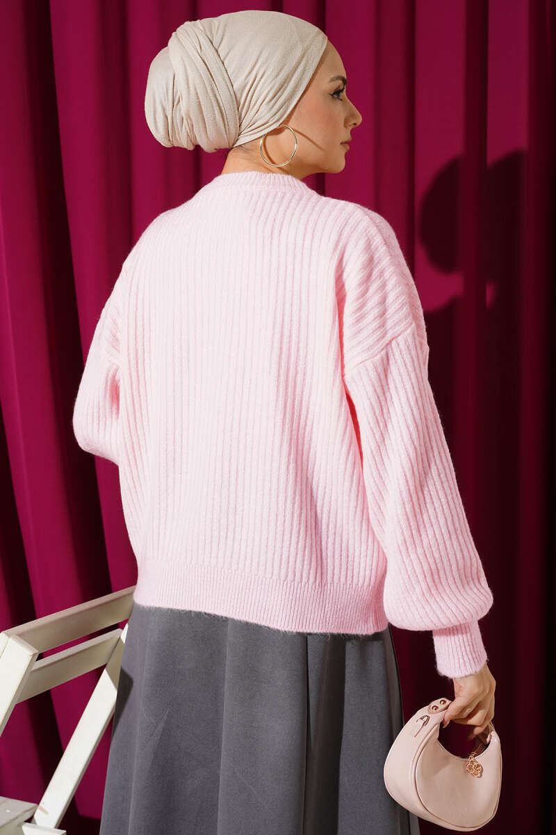 Çizgi Kabartmalı Triko Kazak Yağ Yeşili