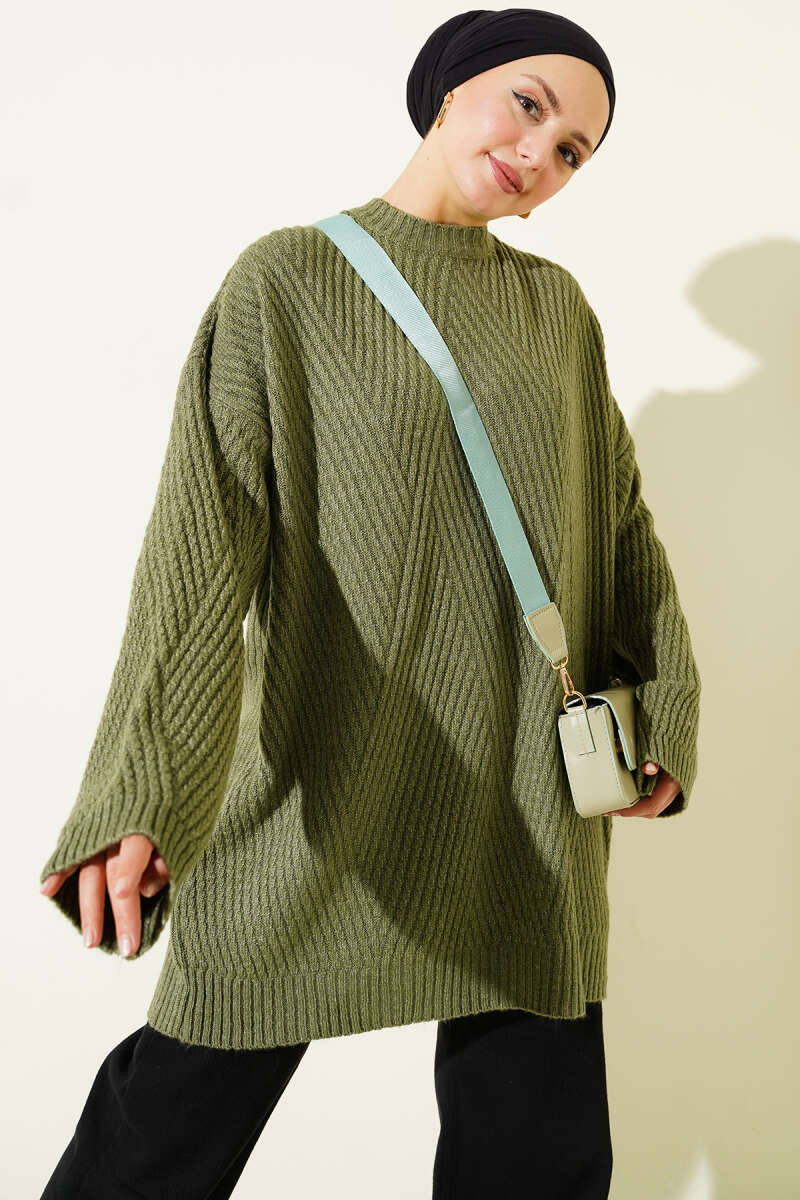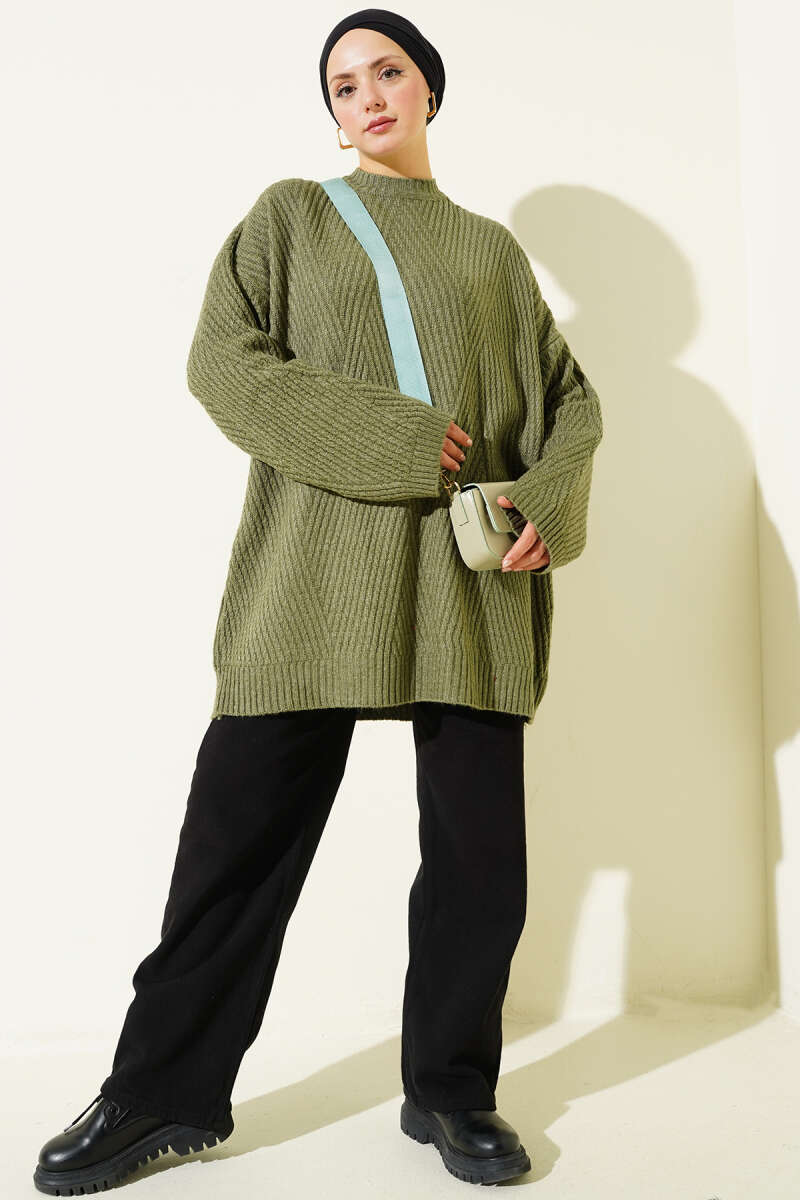 Yanı Yırtmaçlı Oversize Triko Tunik Haki