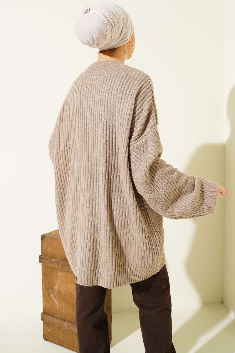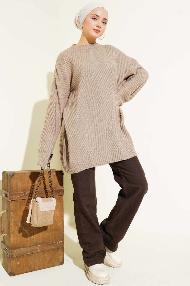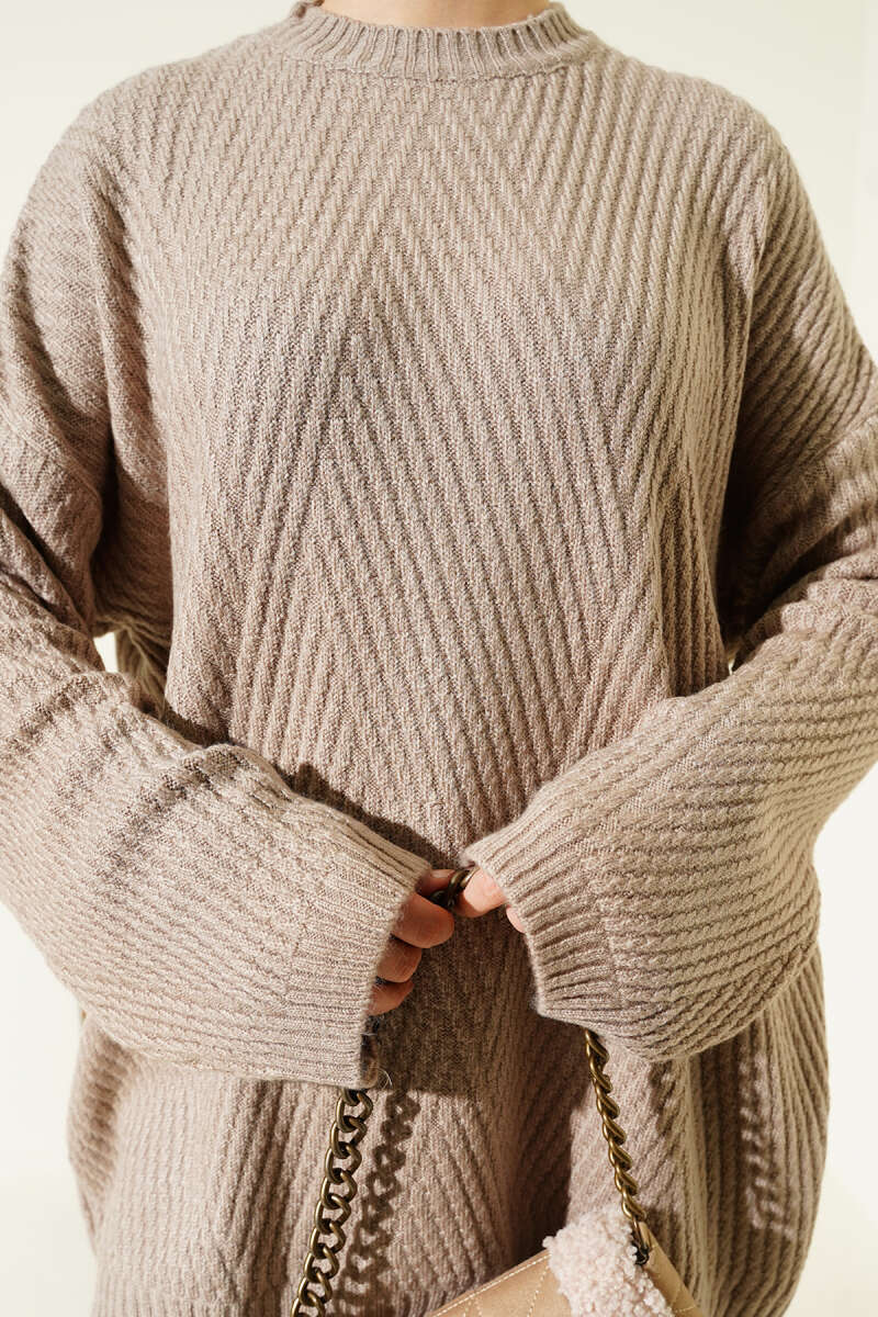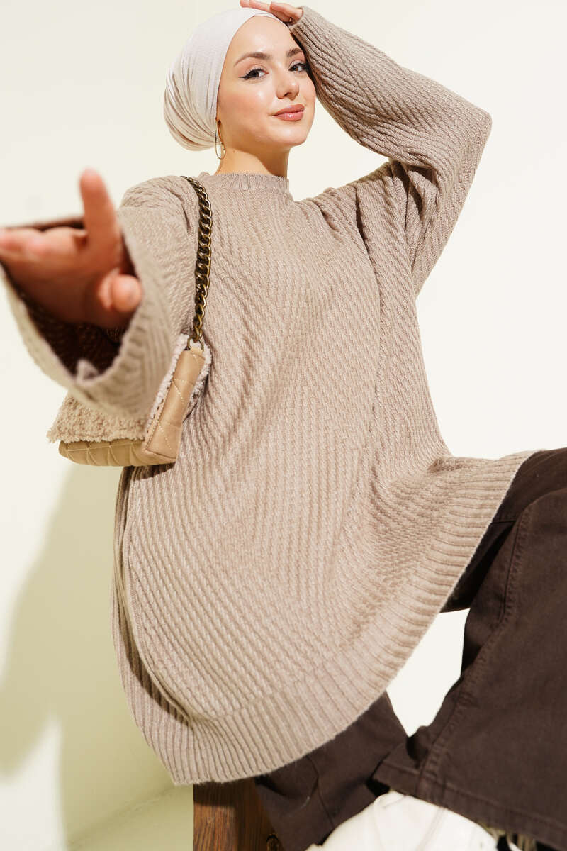Çizgi Kabartmalı Triko Tunik Vizon