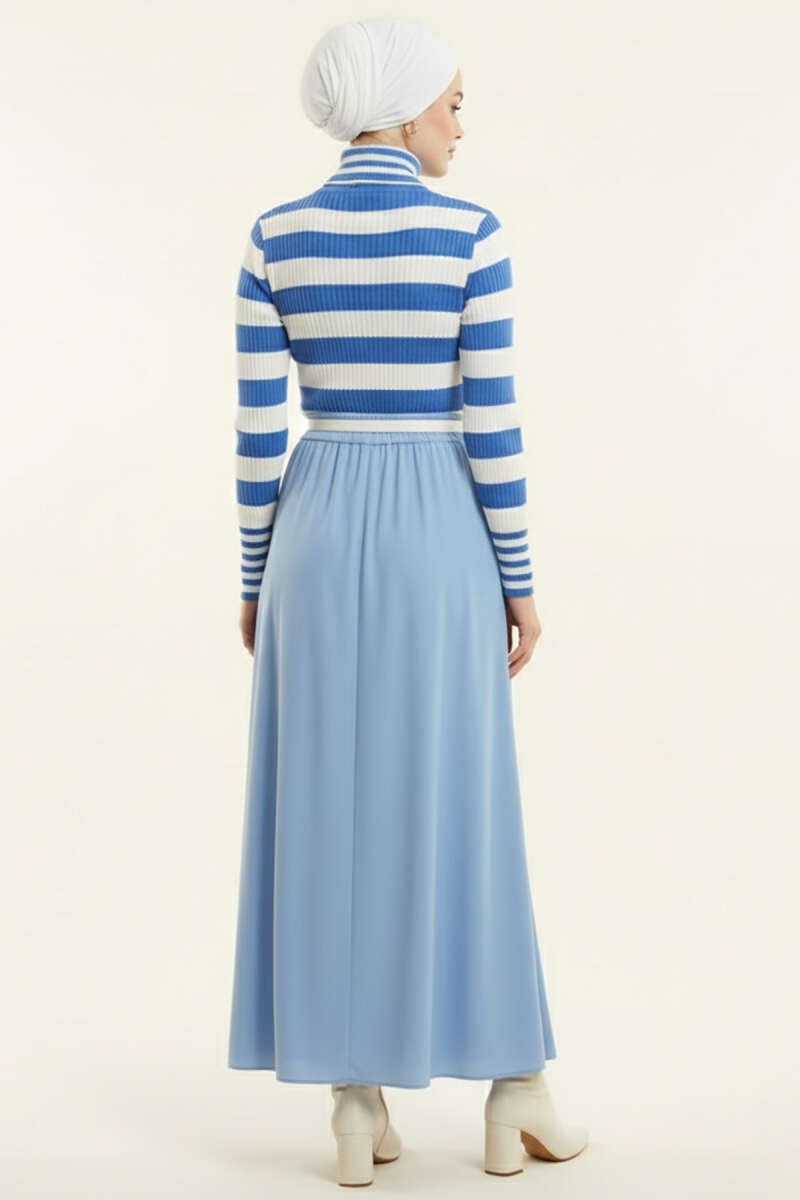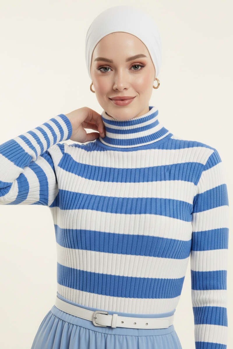 Çizgili Balıkçı Yaka Detaylı Triko Kazak Mavi
