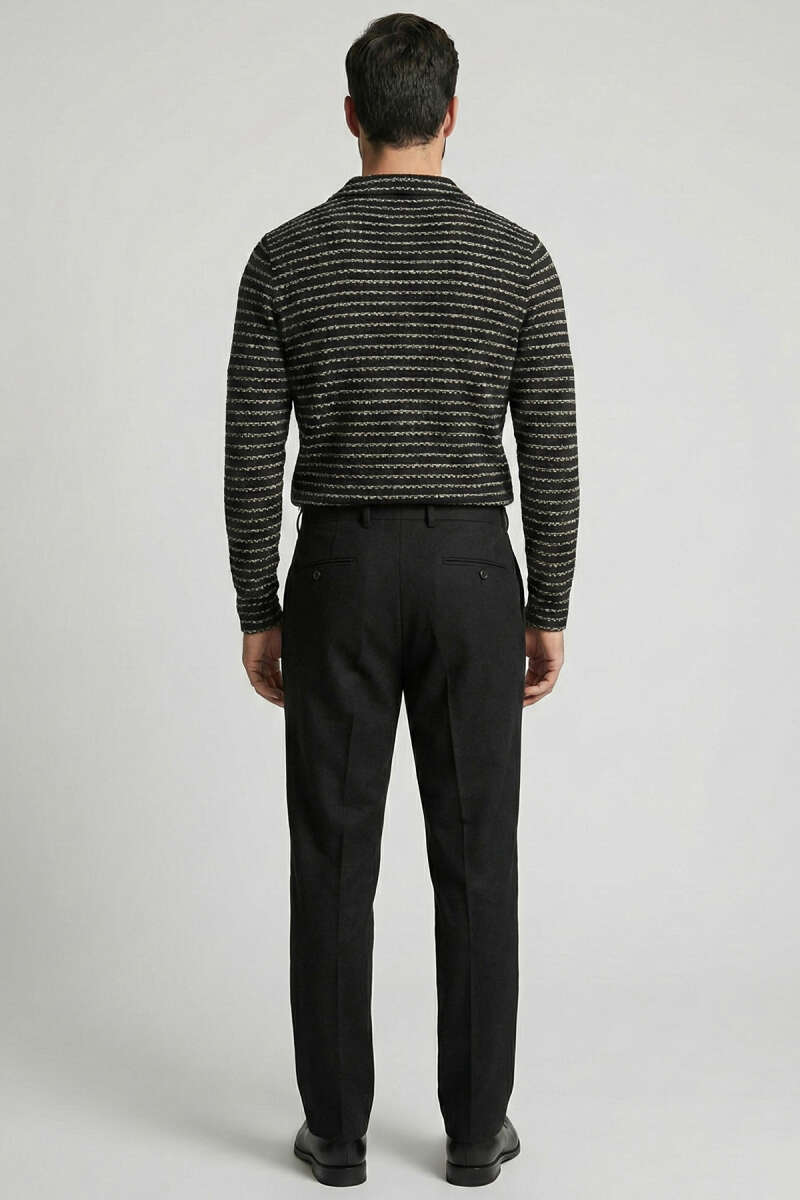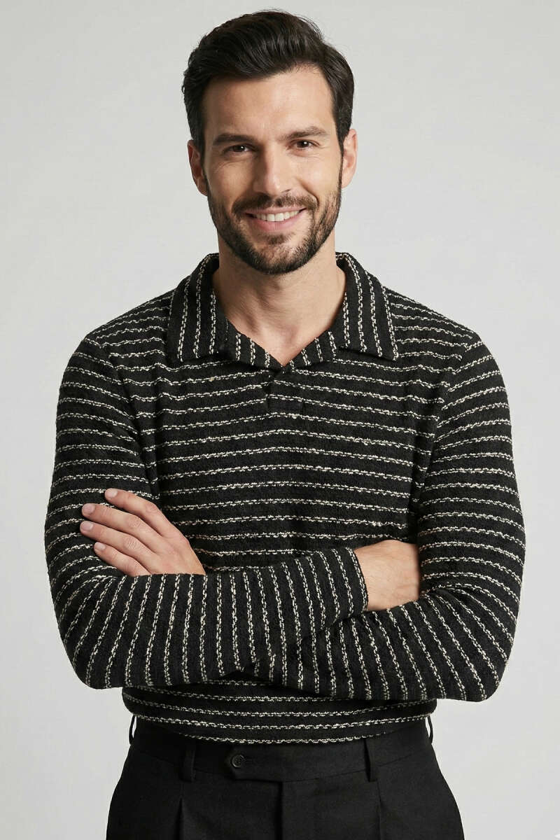 Çizgi Desen Örgü Triko Erkek Kazak Siyah