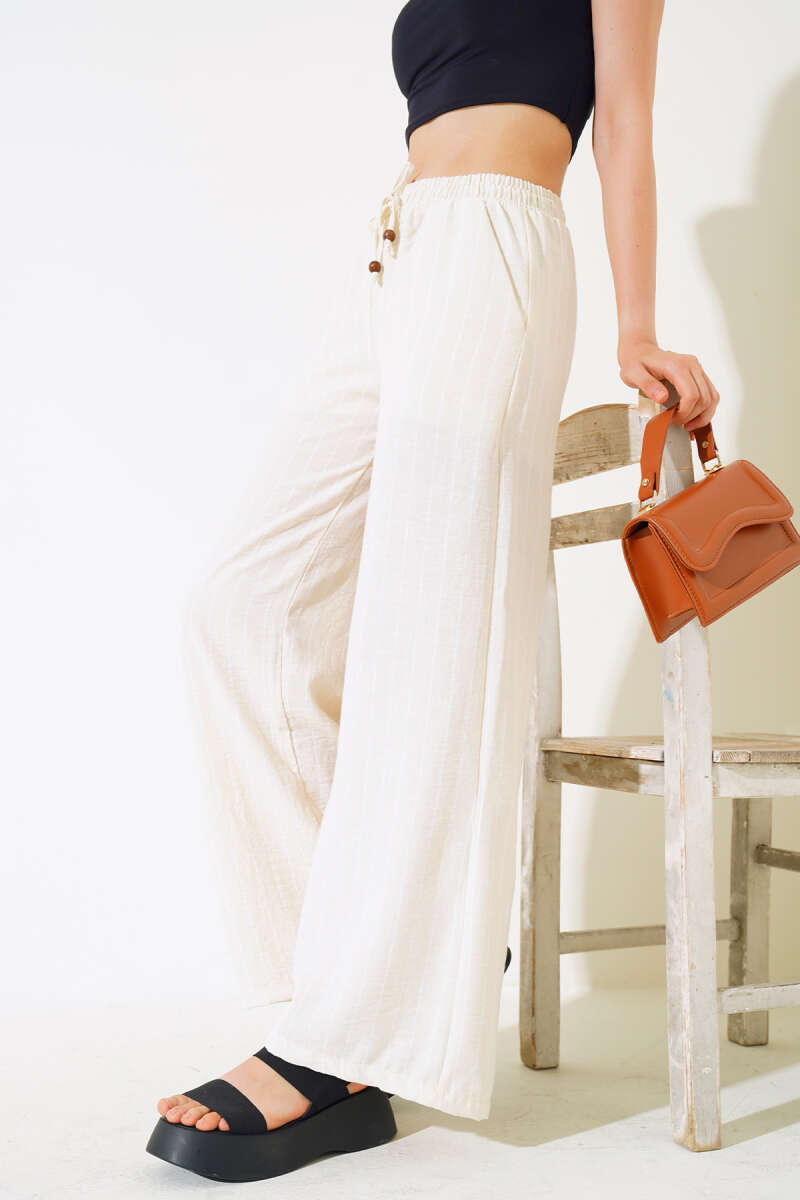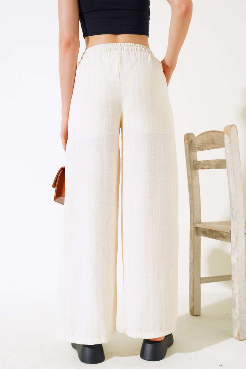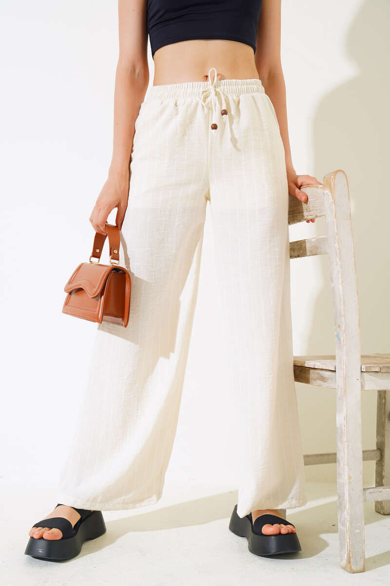 Çizgili Bel Lastikli Keten Pantolon Ekru
