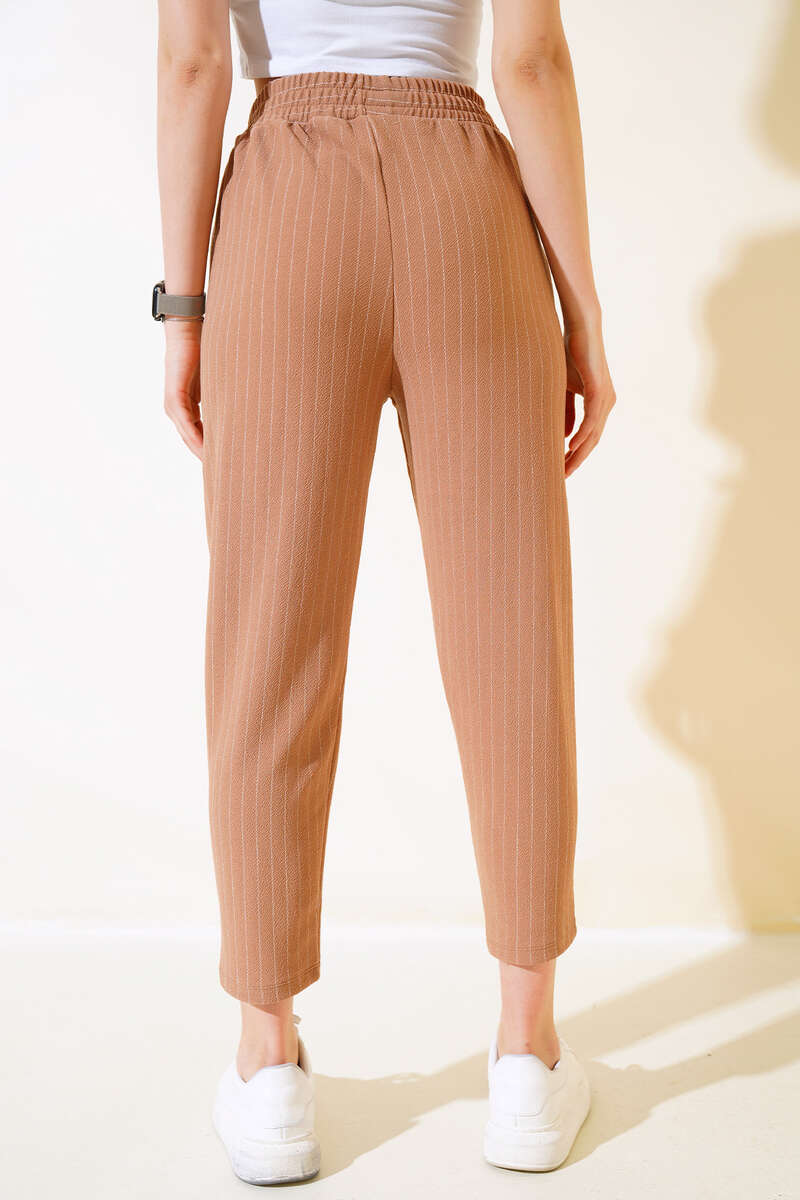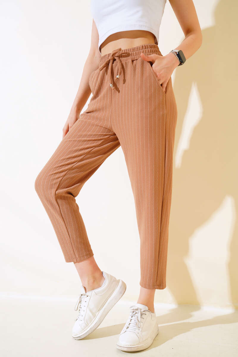Yeni sezon pantolon modelimiz sizlerle beraber. Pantolonumuzun beli lastiklidir. İki adet cebi vardır. Çizgili modeldir. Belinde süs bağcığı vardır. Likralıdır. Hem şık hem sportif kombinlerinize uyum sağlayacaktır.