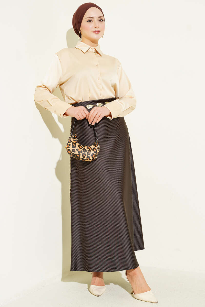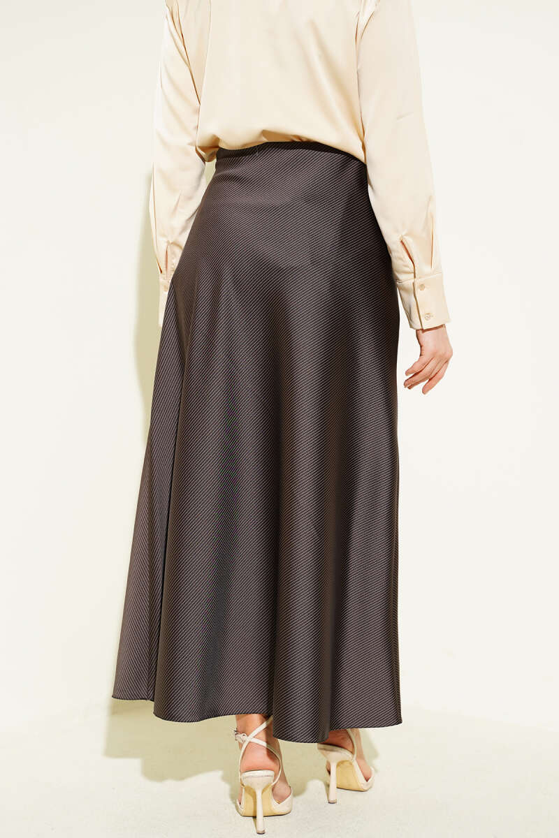 Çizgili Bel Lastikli Saten Etek Kahve