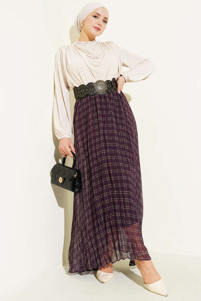 Çizgili Bel Lastikli Şifon Etek Mürdüm