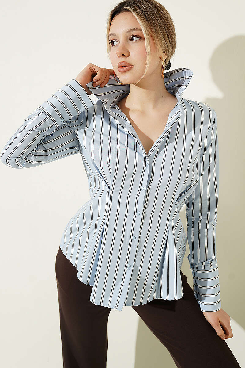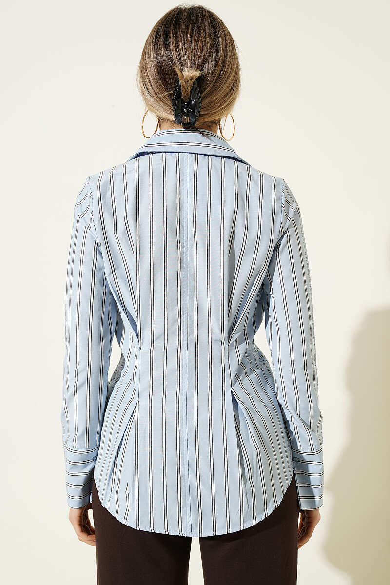 Çizgili Beli Pensli Kısa Gömlek Mavi