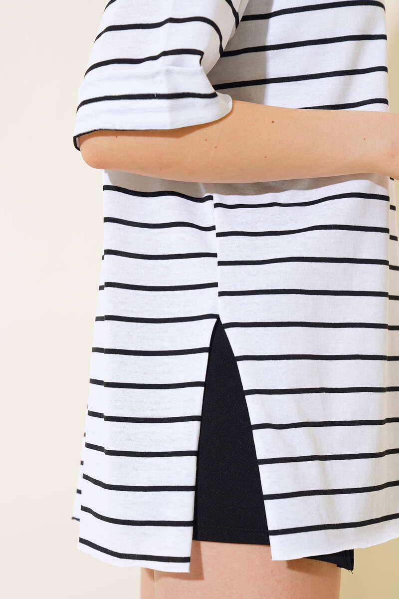 Bu yaz tarzıyla fark yaratan tshirtümüz çizgili desenleriyle dikkat çekmektedir. Oval yaka olan tshirt modelimizin yanları yırtmaçlıdır. Renk seçenekleri mevcuttur.