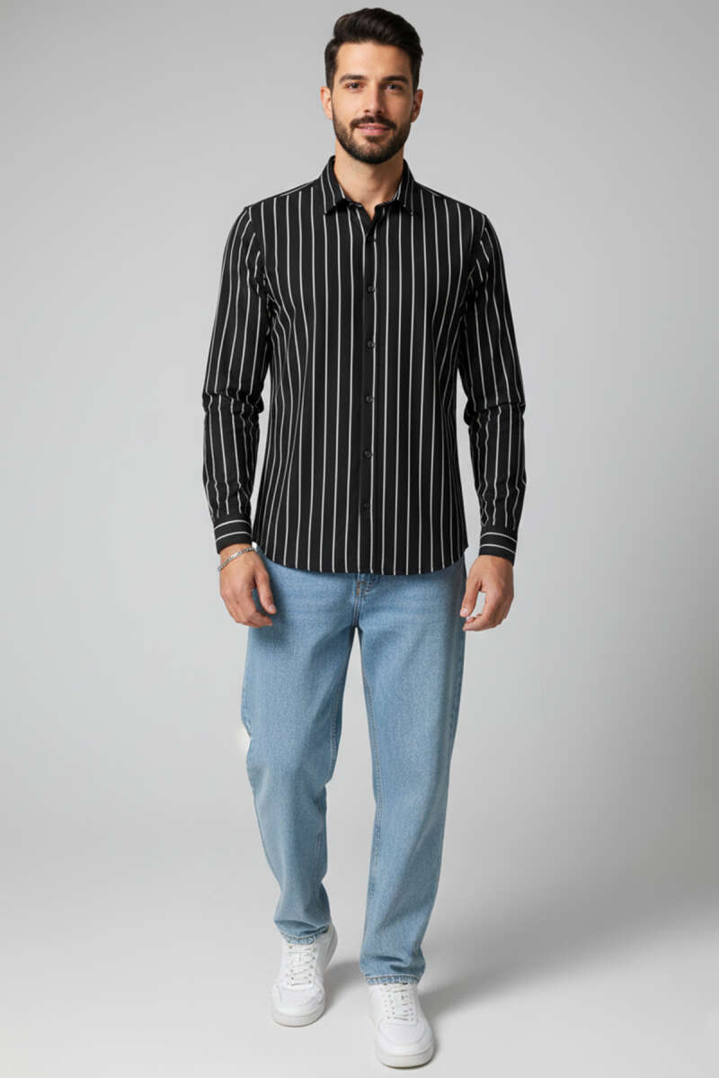 Jakar Desenli Dik Çizgili Erkek Gömlek Siyah