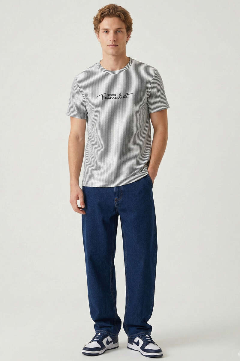 Çizgili Bisiklet Yaka T-shirt Siyah