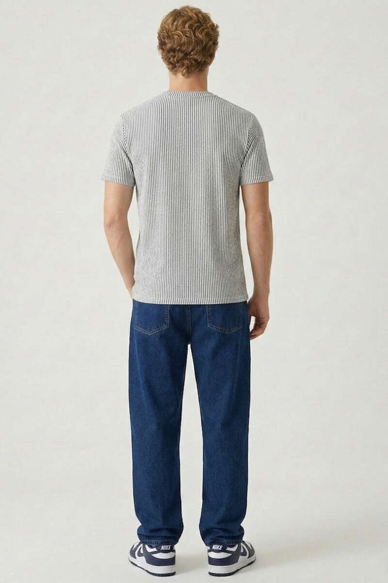 Çizgili Bisiklet Yaka T-shirt Gri