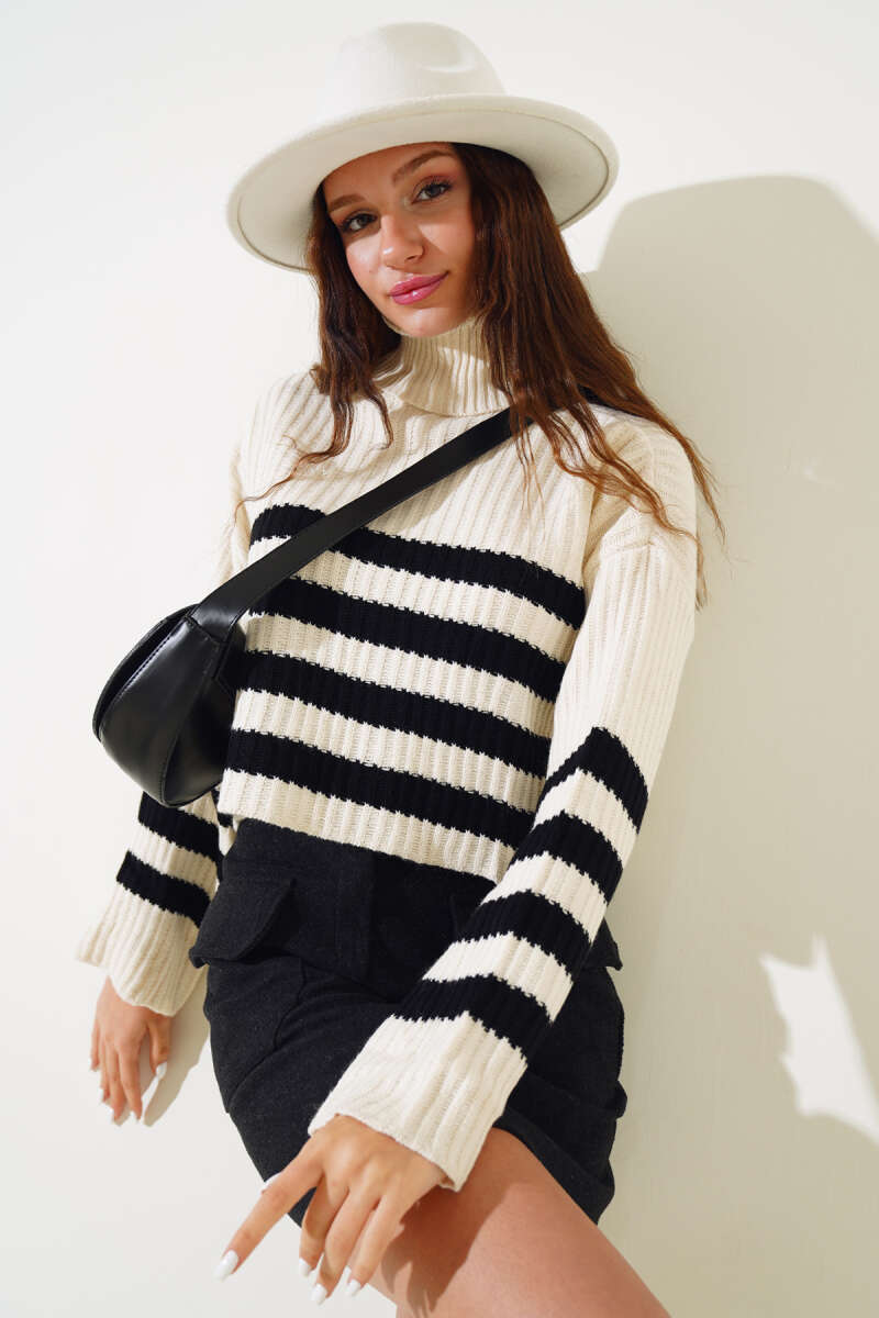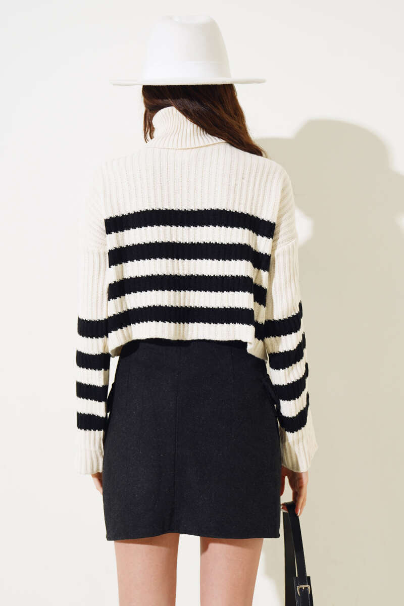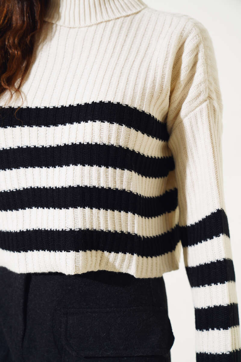 Çizgili Boğazlı Triko Crop Kazak Bej