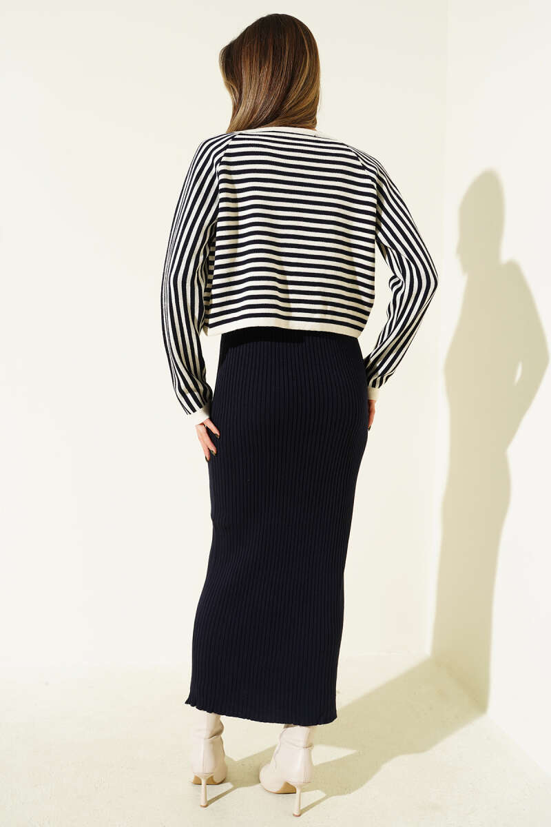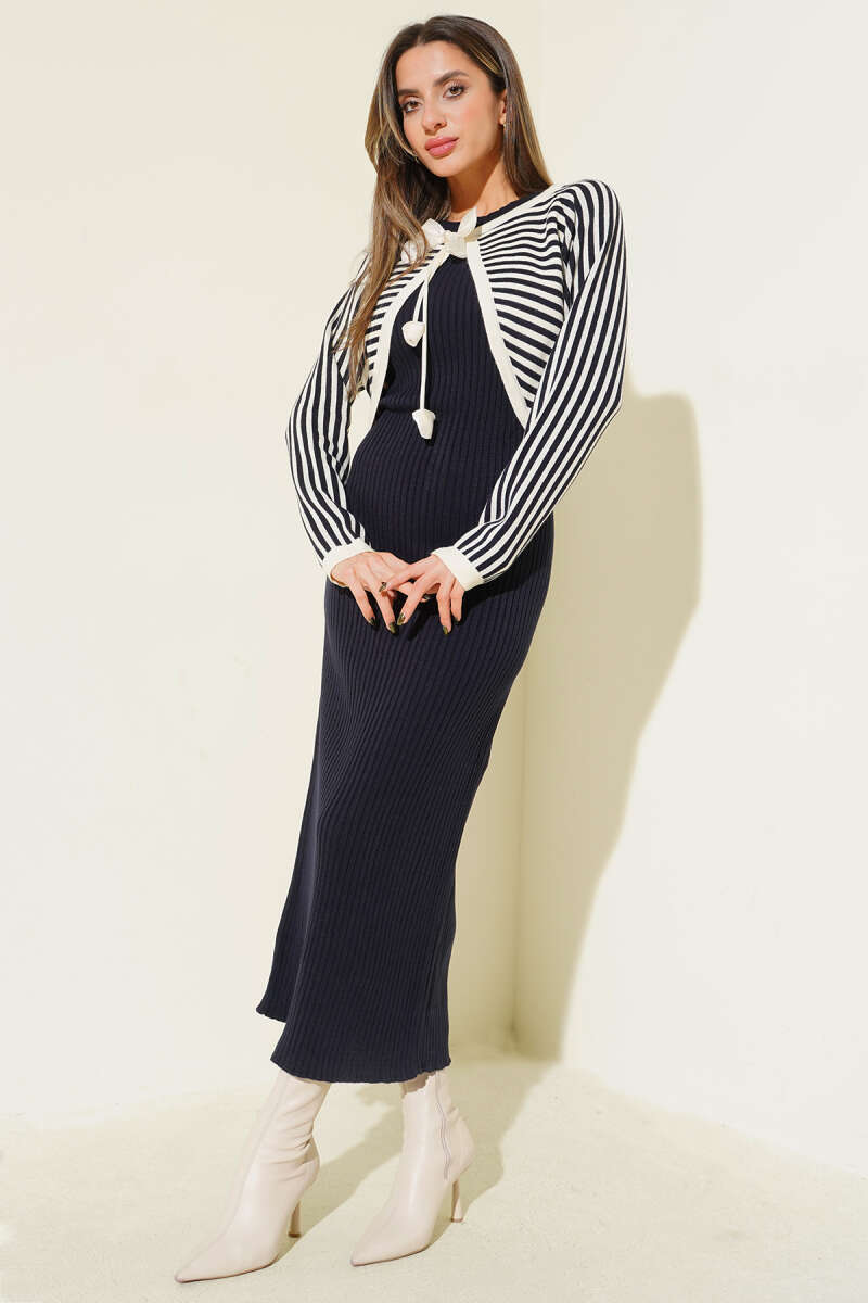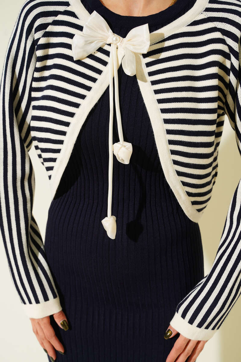 Çizgili Bolerolu Triko İkili Takım Lacivert