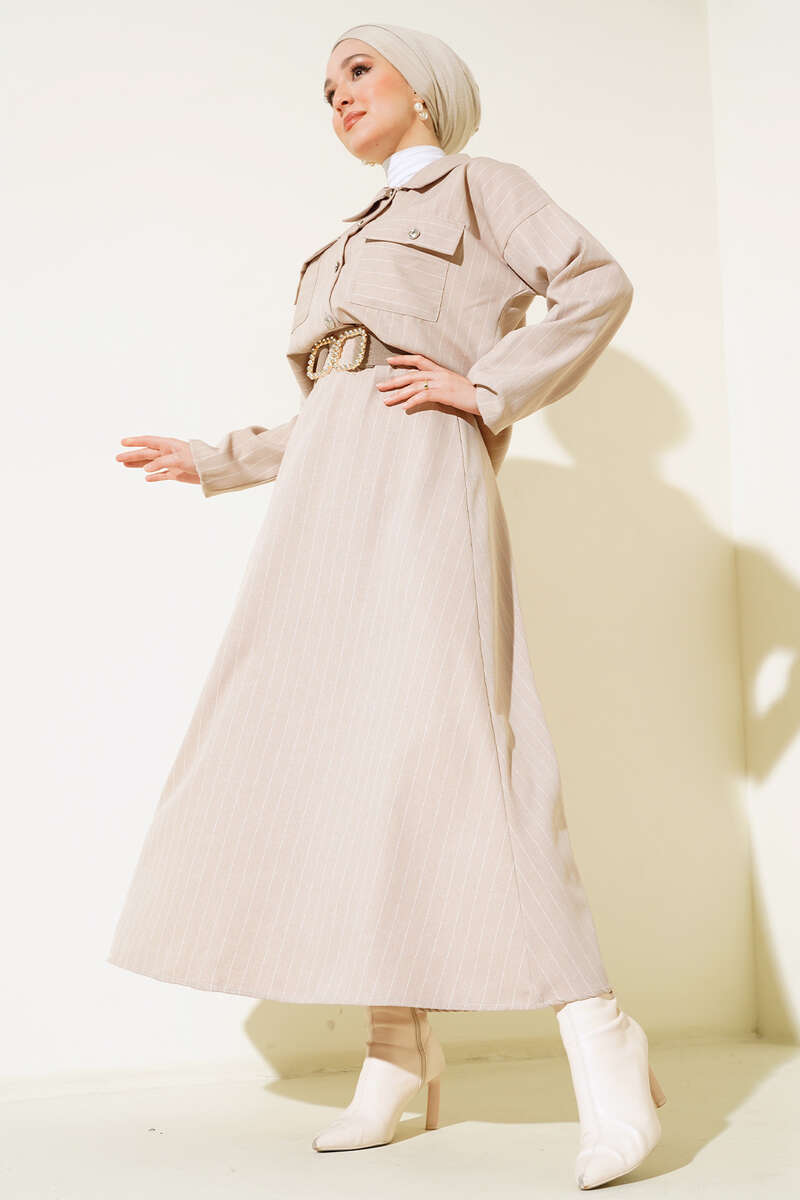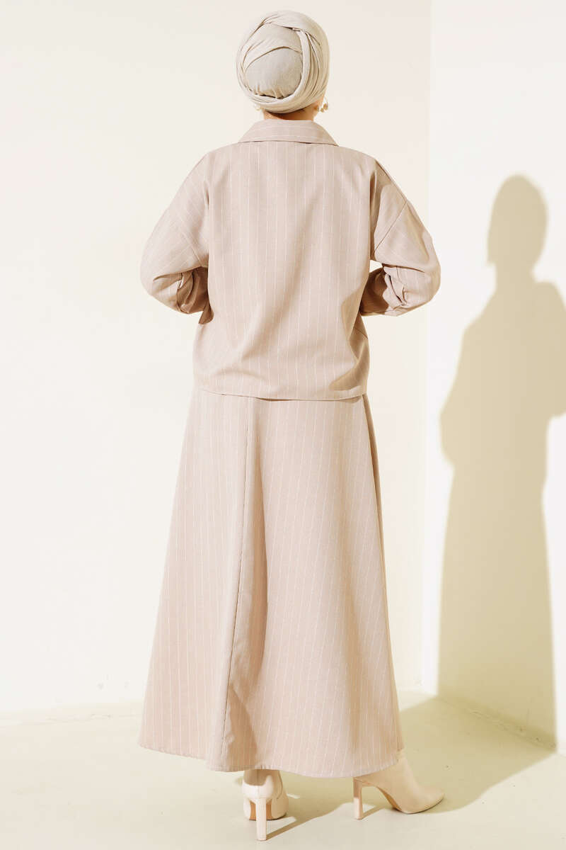 Yeni sezon ikili takımımız gömlek ve etekten oluşmaktadır. Gömleğimizin iki adet göğüs cebi bulunmaktadır. Boydan düğmelidir. Kol uçları lastiklidir. İkili takımımızın eteği kloş modeldir. Beli lastiklidir. Gömlek ve etek takımımız çizgili modeldir. Şık takımımız dolaplarınızda yerlerini beklemektedir.