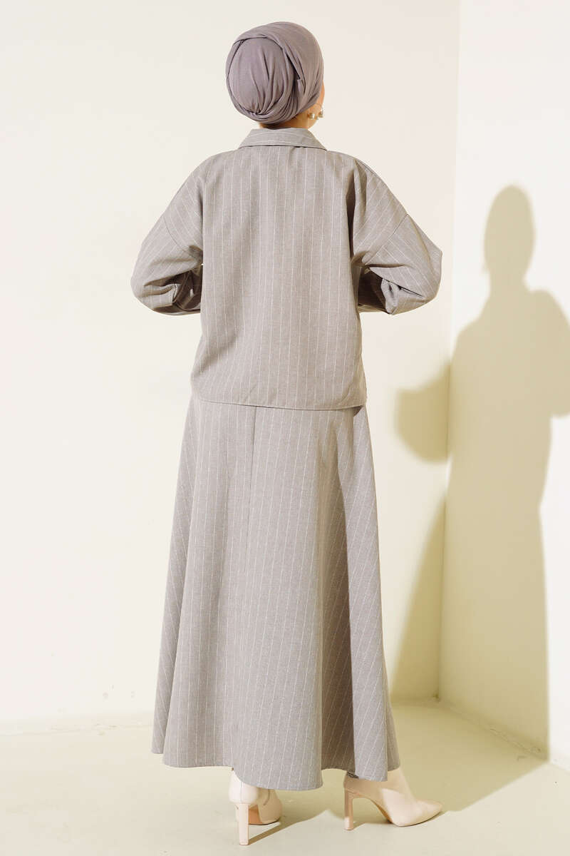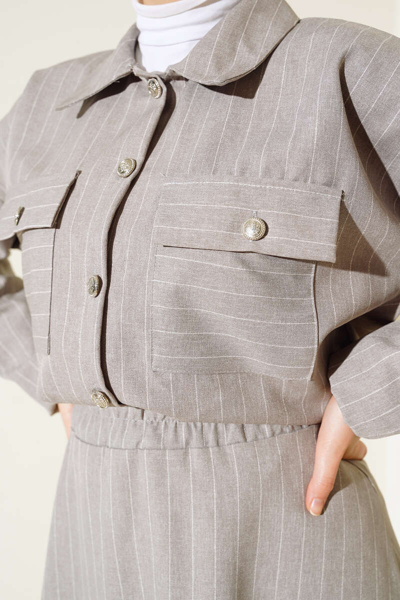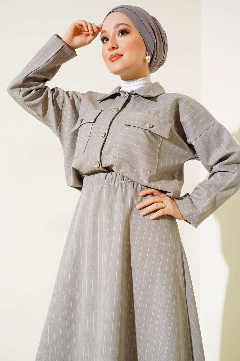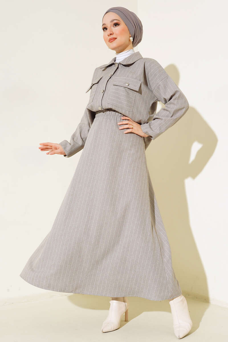 Yeni sezon ikili takımımız gömlek ve etekten oluşmaktadır. Gömleğimizin iki adet göğüs cebi bulunmaktadır. Boydan düğmelidir. Kol uçları lastiklidir. İkili takımımızın eteği kloş modeldir. Beli lastiklidir. Gömlek ve etek takımımız çizgili modeldir. Şık takımımız dolaplarınızda yerlerini beklemektedir.