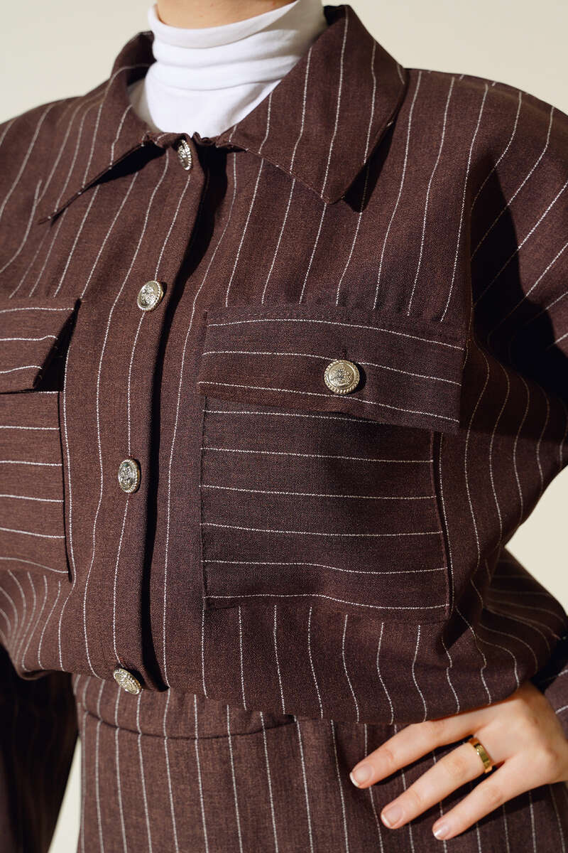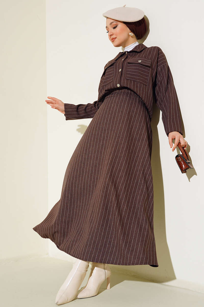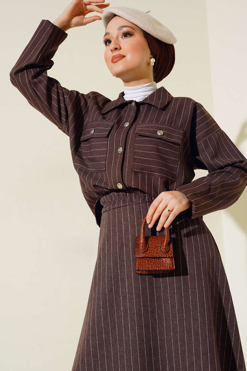Çizgili Cepli Etekli Takım Kahve
