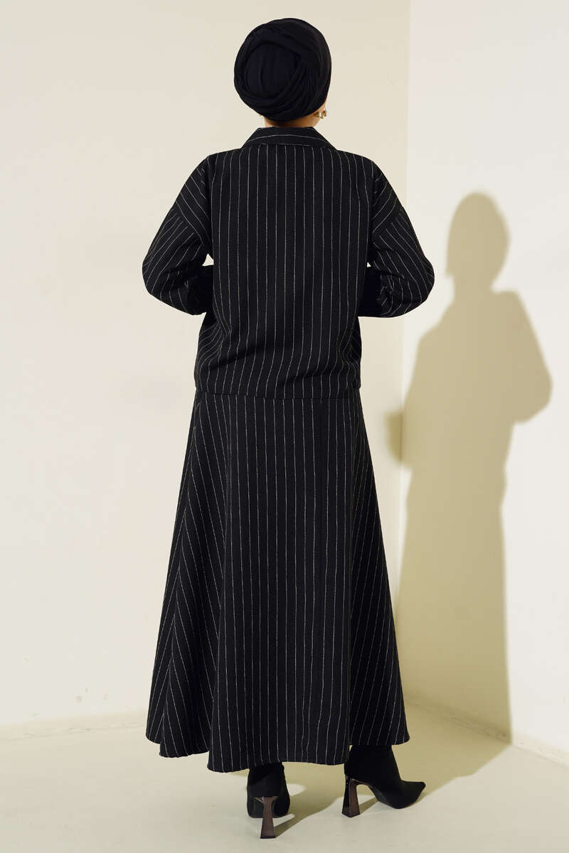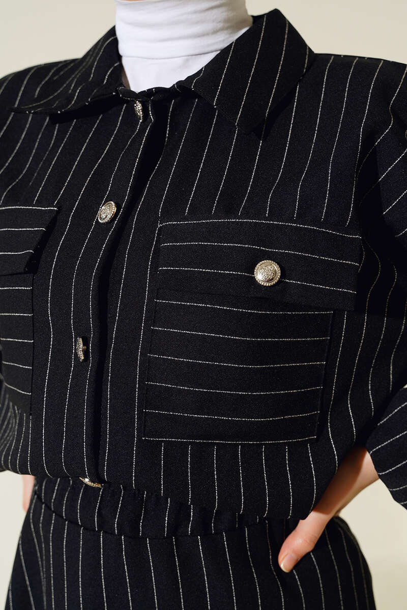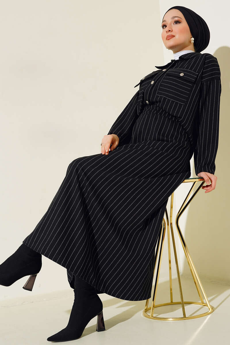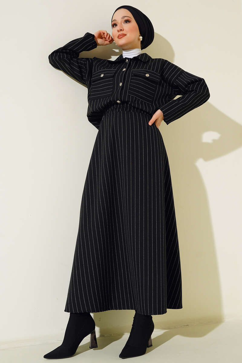 Yeni sezon ikili takımımız gömlek ve etekten oluşmaktadır. Gömleğimizin iki adet göğüs cebi bulunmaktadır. Boydan düğmelidir. Kol uçları lastiklidir. İkili takımımızın eteği kloş modeldir. Beli lastiklidir. Gömlek ve etek takımımız çizgili modeldir. Şık takımımız dolaplarınızda yerlerini beklemektedir.
