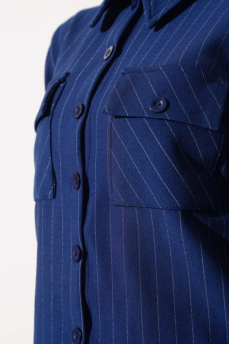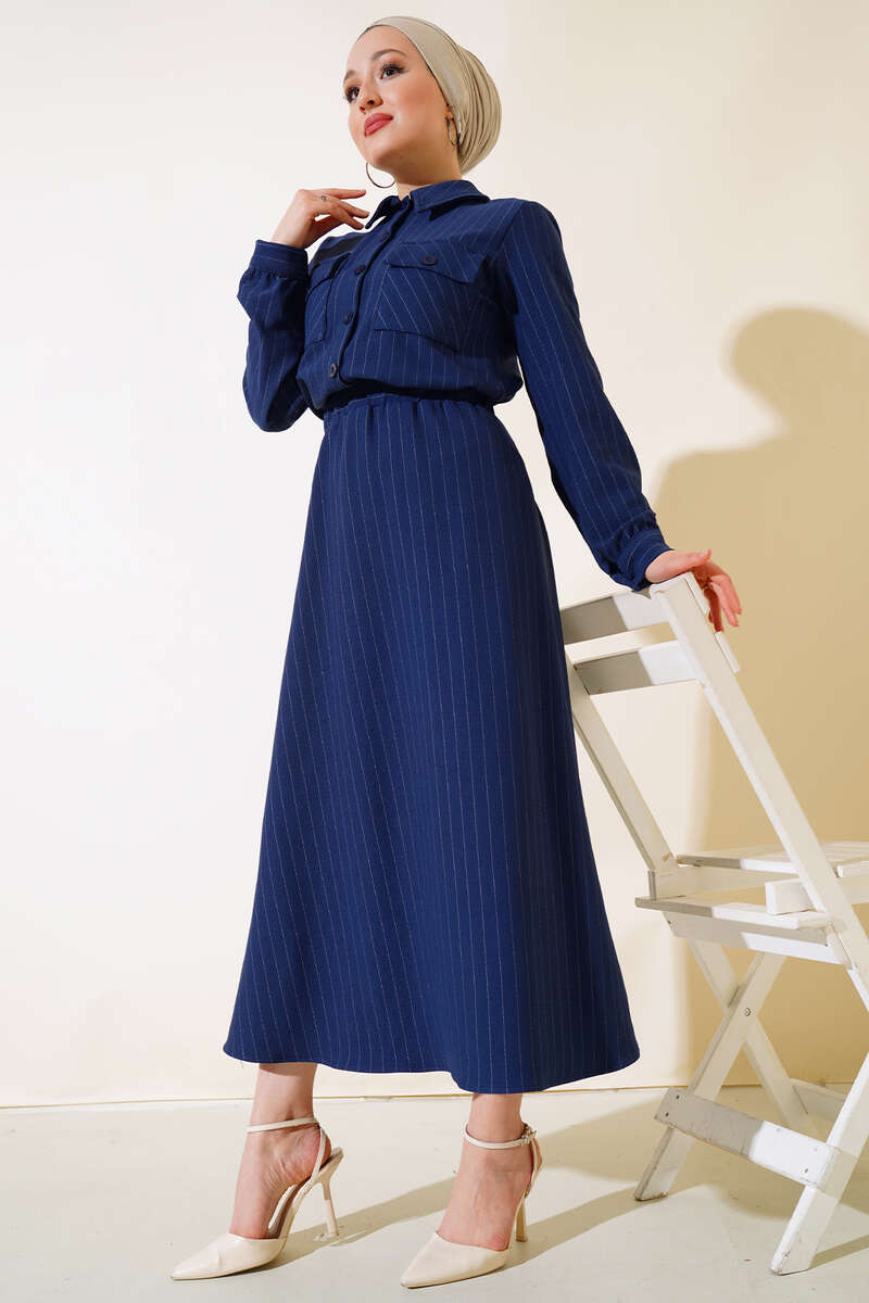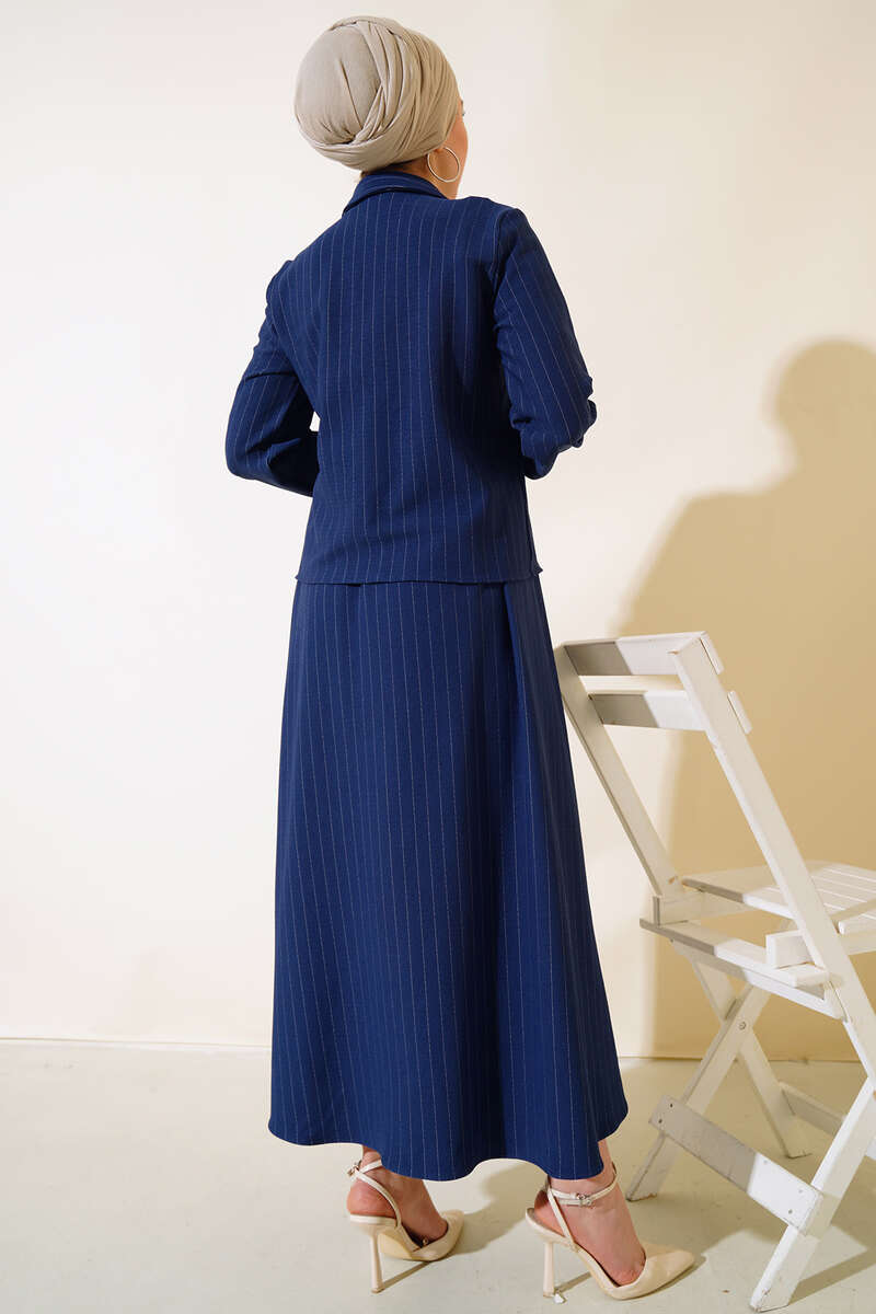 Çizgili Çift Cepli Etekli Takım Lacivert