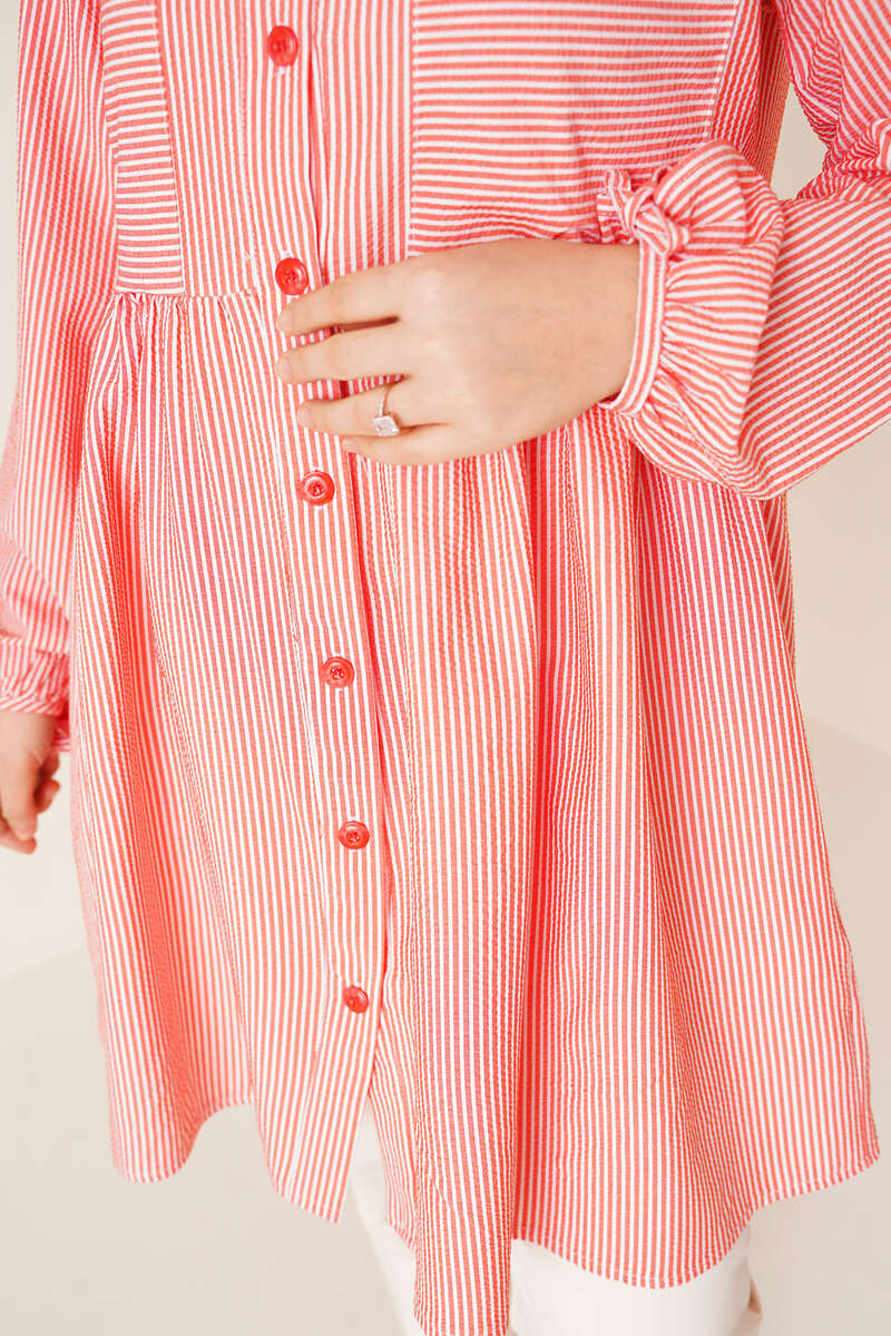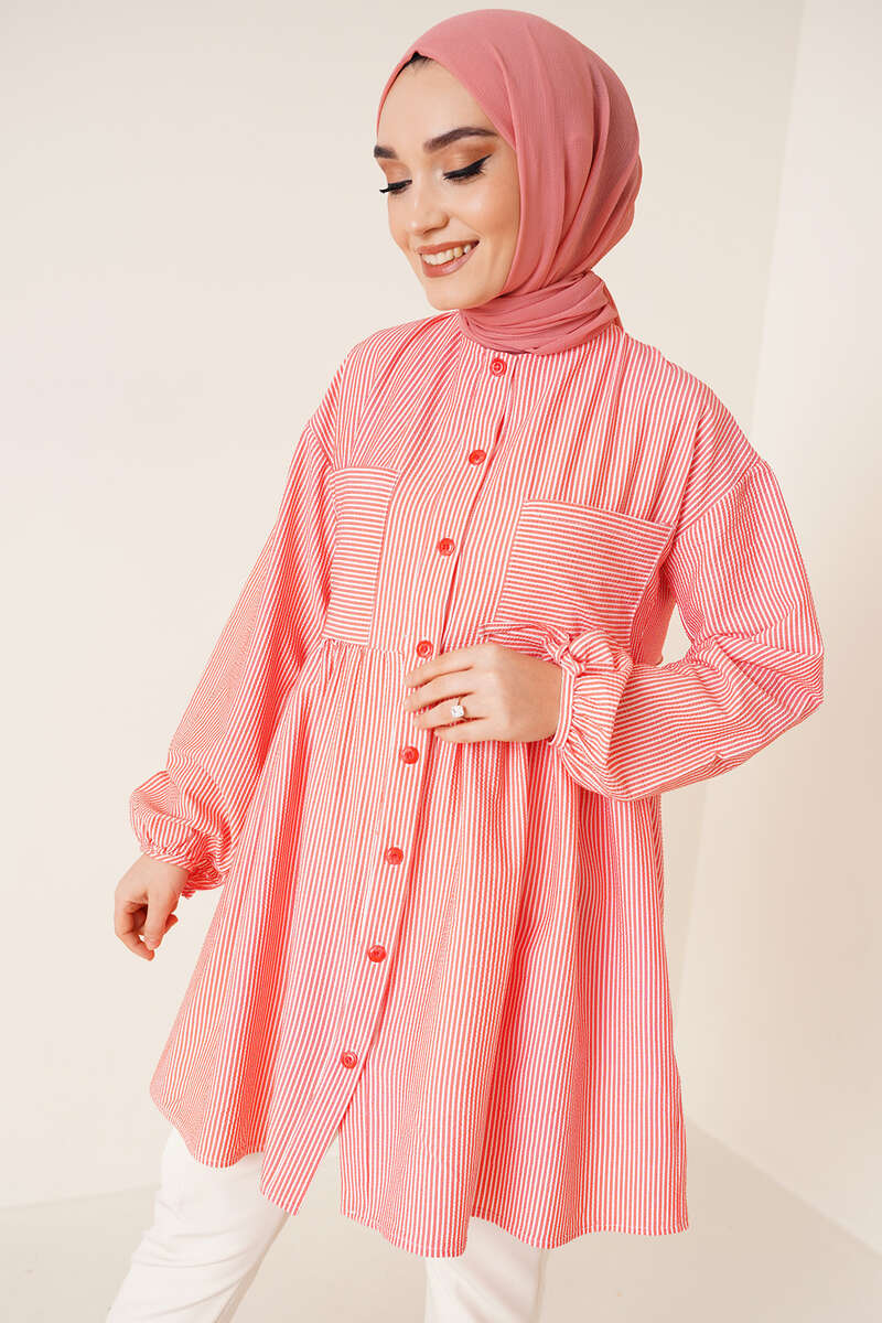 Çizgili Çift Cepli Gofre Gömlek Alizarin
