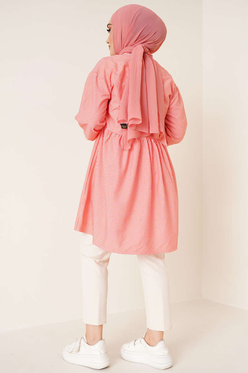 Yeni sezon gofre  gömleğimiz ince çizgileriyle sportif bir görünüm kazanmıştır. Beli büzgü detaylı olan gömleğimizin göğsünde iki adet cebi bulunmaktadır. Cepleri kullanılabilmektedir. Düşük omuz model olan gömleğimizin bilekleri ip bağlamalıdır.