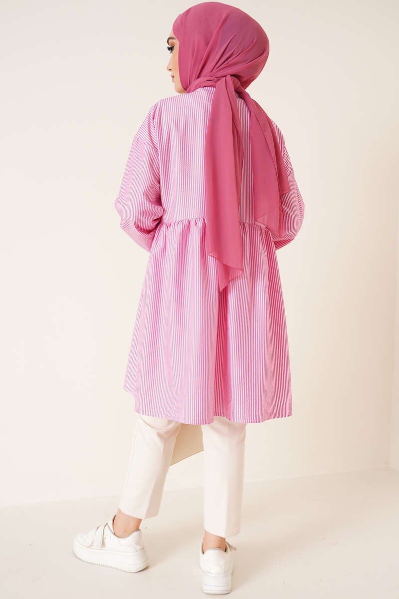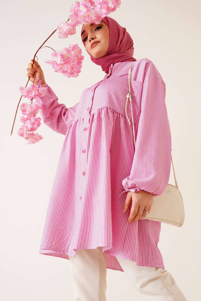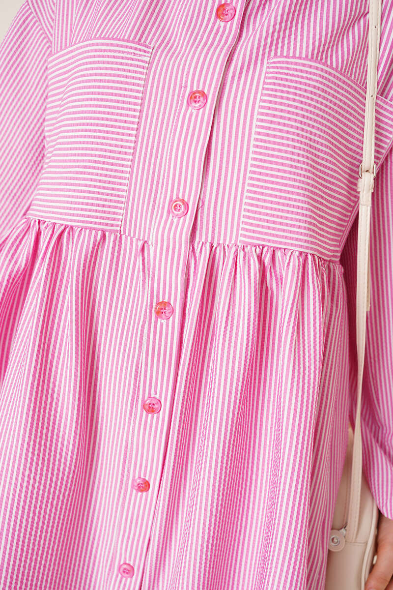 Çizgili Çift Cepli Gofre Gömlek Fuşya
