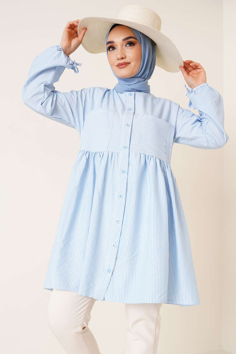 Yeni sezon gofre  gömleğimiz ince çizgileriyle sportif bir görünüm kazanmıştır. Beli büzgü detaylı olan gömleğimizin göğsünde iki adet cebi bulunmaktadır. Cepleri kullanılabilmektedir. Düşük omuz model olan gömleğimizin bilekleri ip bağlamalıdır.