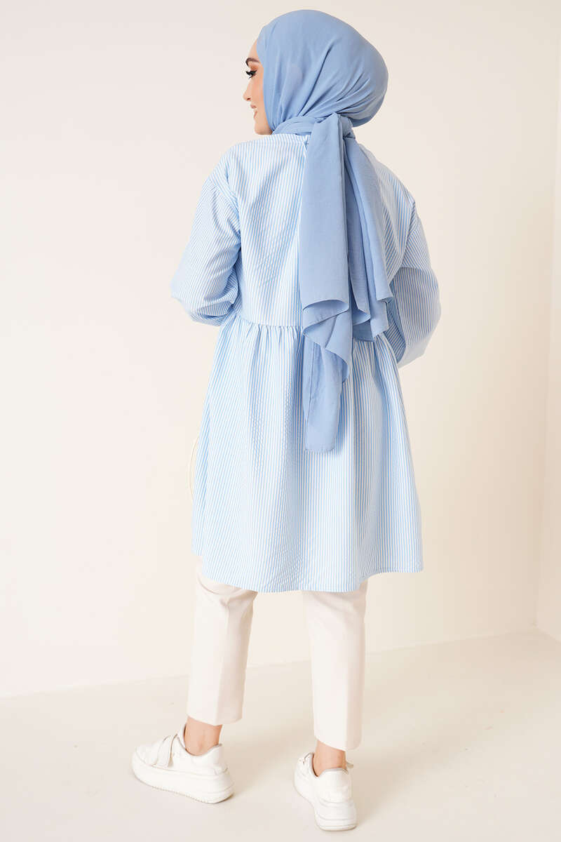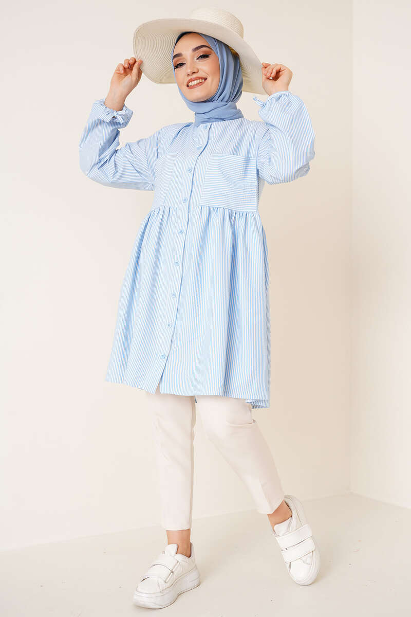 Yeni sezon gofre  gömleğimiz ince çizgileriyle sportif bir görünüm kazanmıştır. Beli büzgü detaylı olan gömleğimizin göğsünde iki adet cebi bulunmaktadır. Cepleri kullanılabilmektedir. Düşük omuz model olan gömleğimizin bilekleri ip bağlamalıdır.