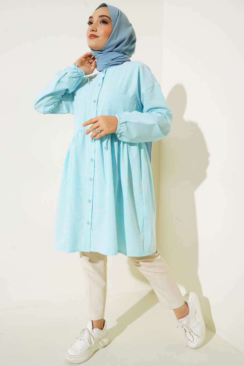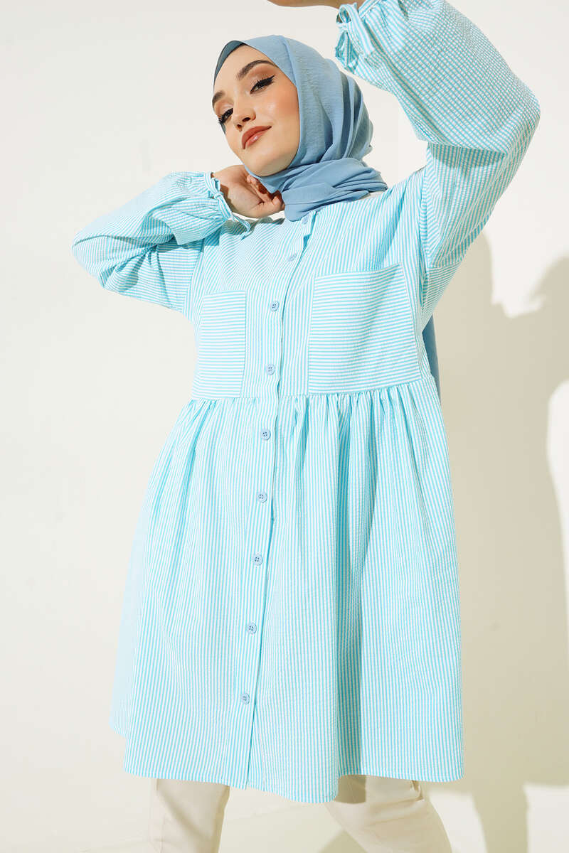 Çizgili Çift Cepli Gofre Gömlek Turkuaz