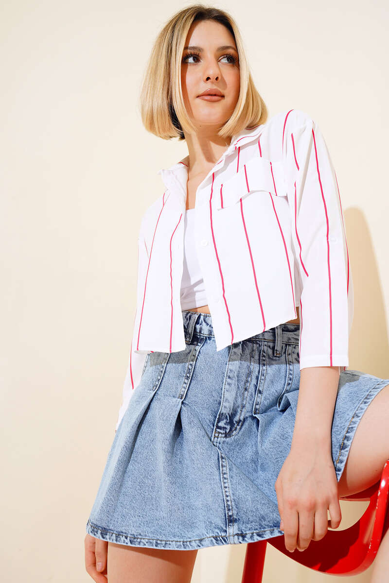 Yeni sezon gömlek modelimiz sizlerle beraber. Gömleğimiz çizgili modeldir. Kolu katlamalıdır. Gömleğimizin göğsünde cep kapak süsü vardır. Crop modeldir. Sade ve şık gömleğimiz renk seçenekleriyle sizleri bekliyor.