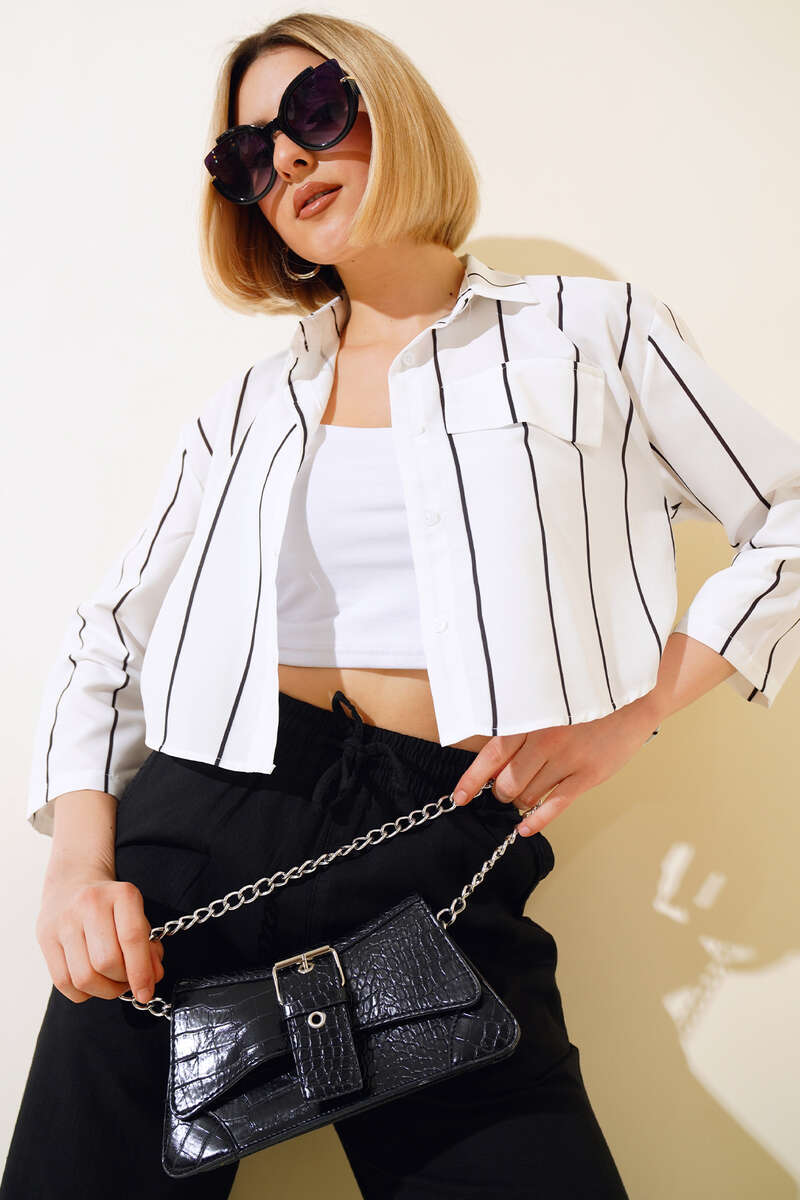 Yeni sezon gömlek modelimiz sizlerle beraber. Gömleğimiz çizgili modeldir. Kolu katlamalıdır. Gömleğimizin göğsünde cep kapak süsü vardır. Crop modeldir. Sade ve şık gömleğimiz renk seçenekleriyle sizleri bekliyor.