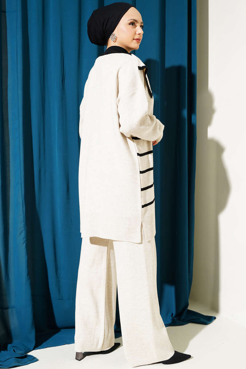 Yaka Kürklü Fermuarlı Triko İkili Takım Bej