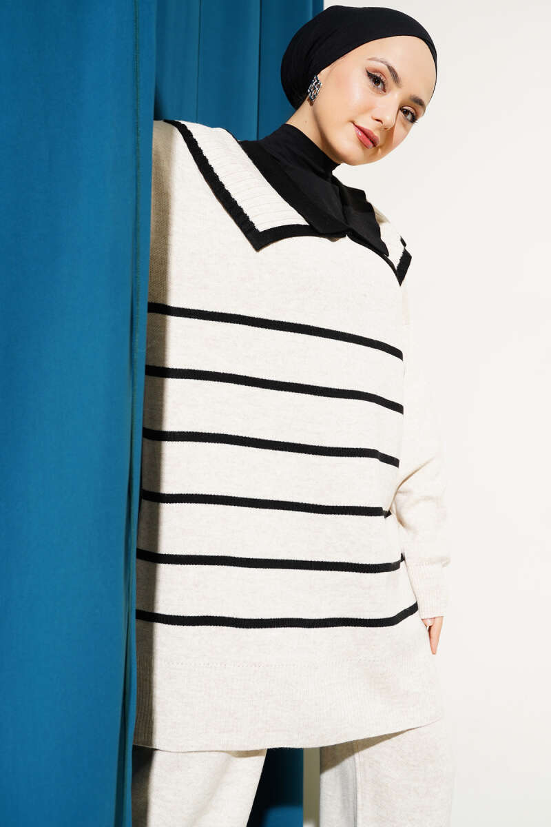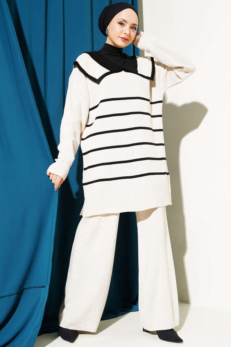 Çizgili Denizci Yaka Triko İkili Takım Saks