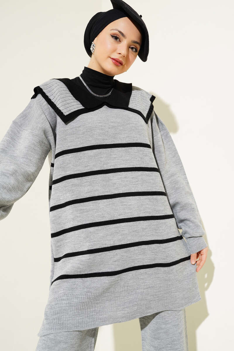 Dik Çizgili Etekli Triko İkili Takım Bisküvi