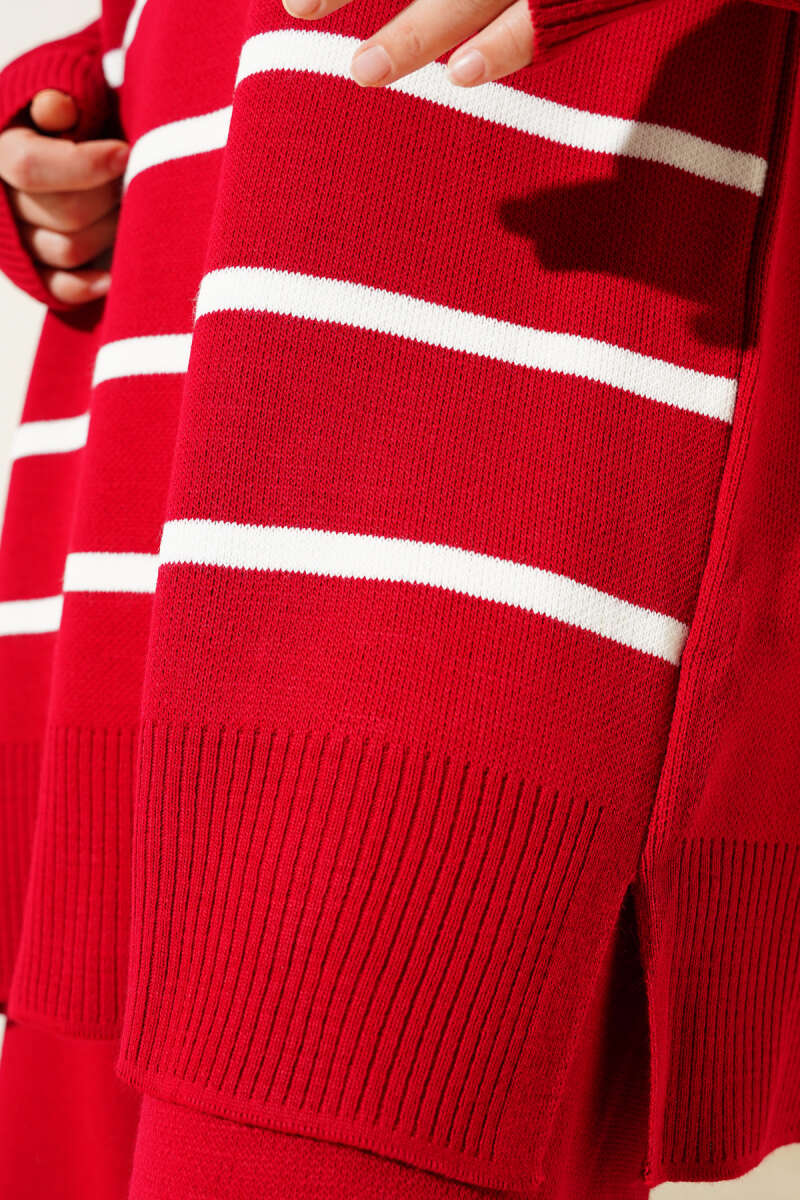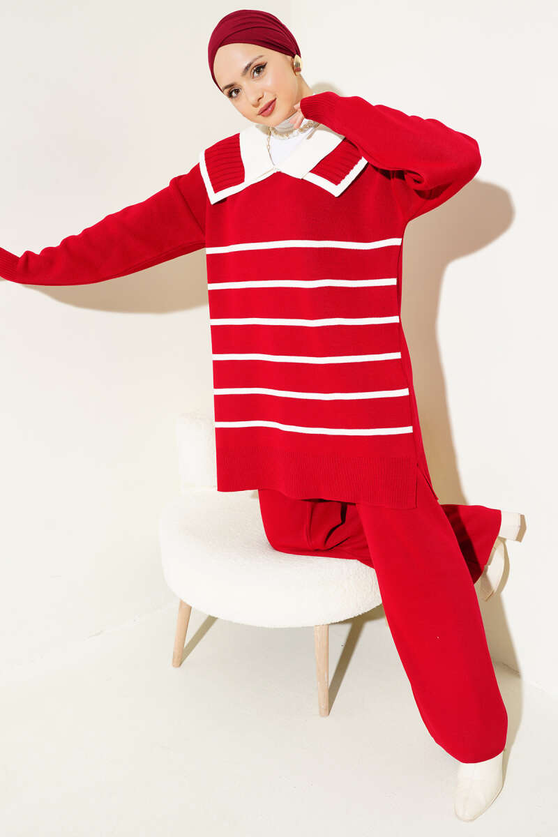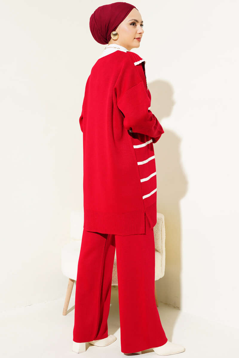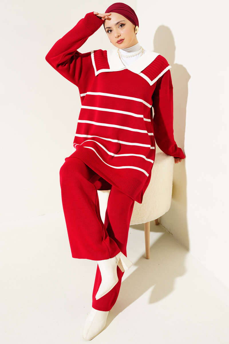 Fitilli Yatay Çizgili Triko İkili Takım Bordo