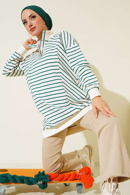 Yeni sezon dik yaka çizgili sweatshirt modelimiz sportif havasıyla göze hitap etmektedir. Dik yaka tuniğimizin yakasında çıtçıt detayı bulunmaktadır. Kol bilekleri rabinalıdır. Düşük omuzlu olan sweatshirt modelimiz sizleri beklemektedir.