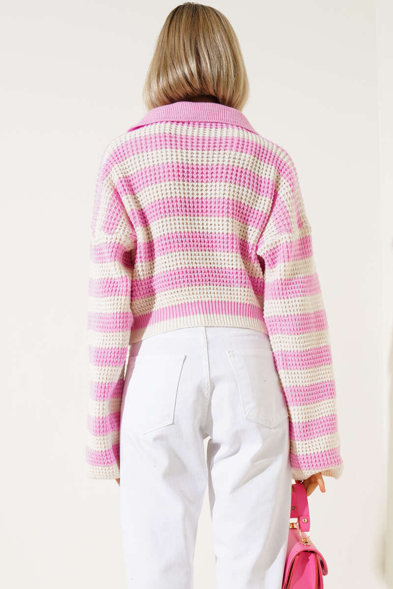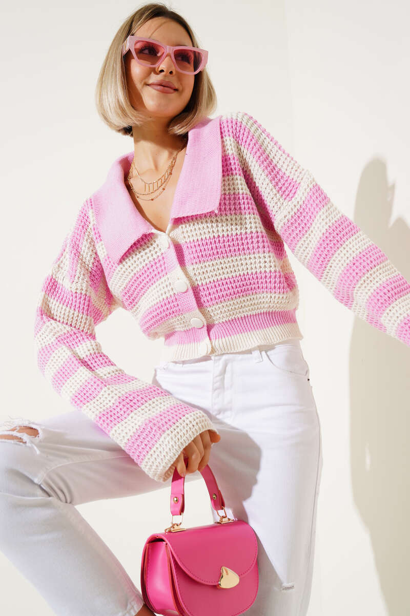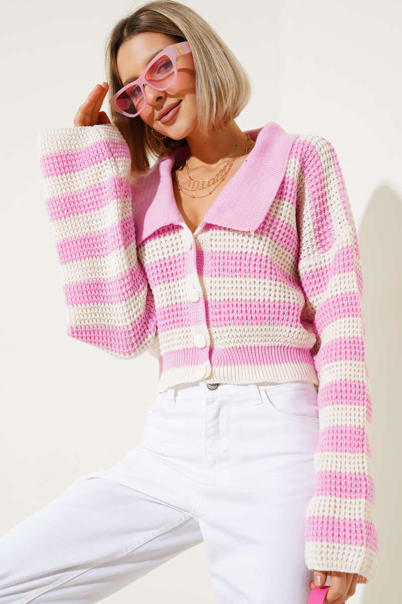 Çizgili Düğmeli Kısa Triko Hırka Kahve