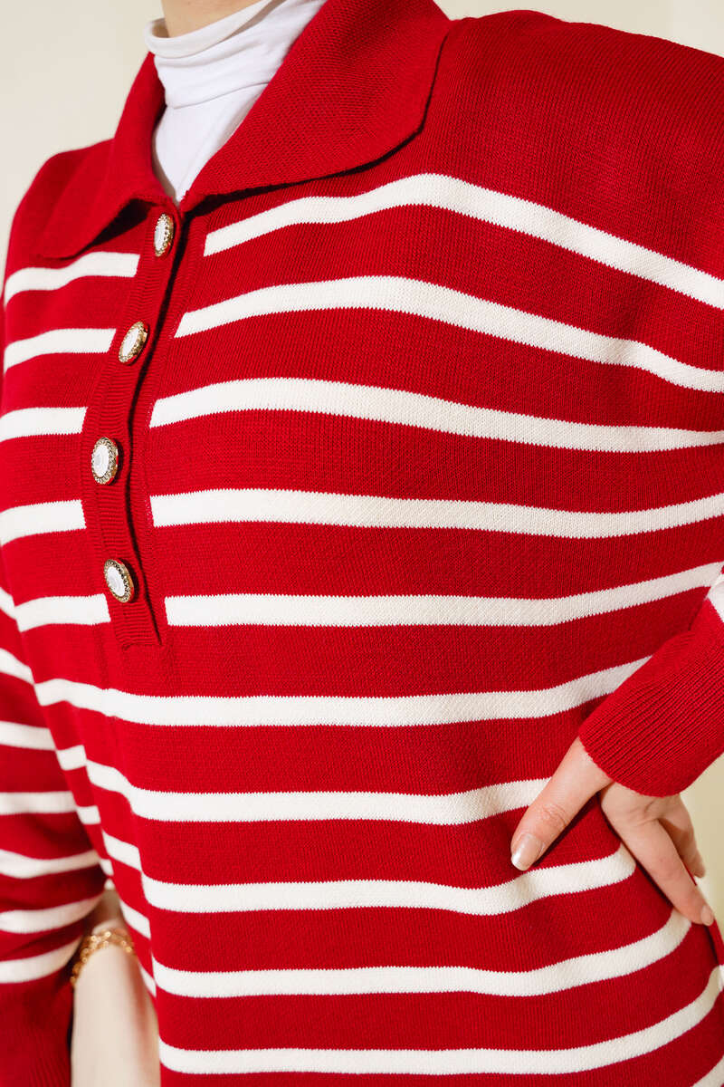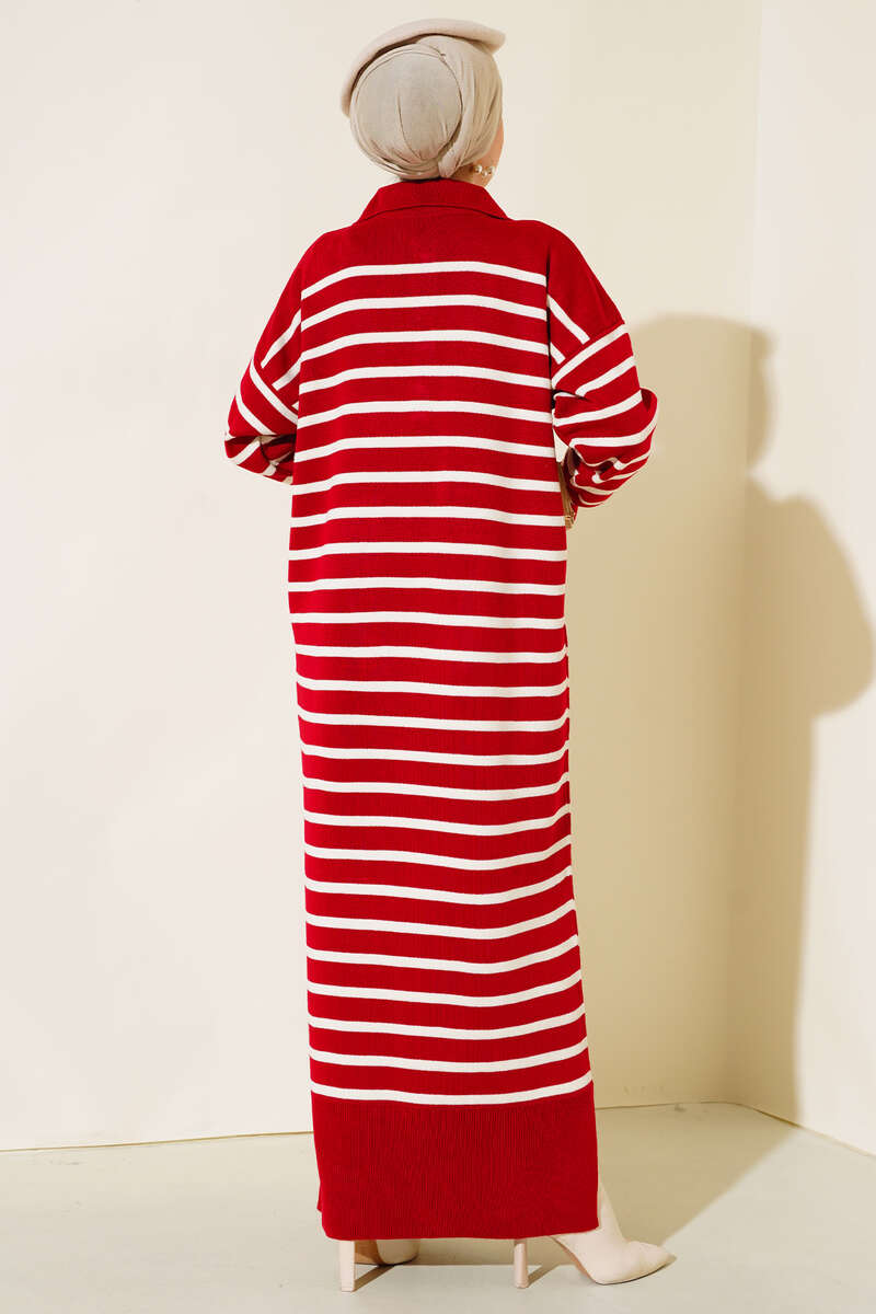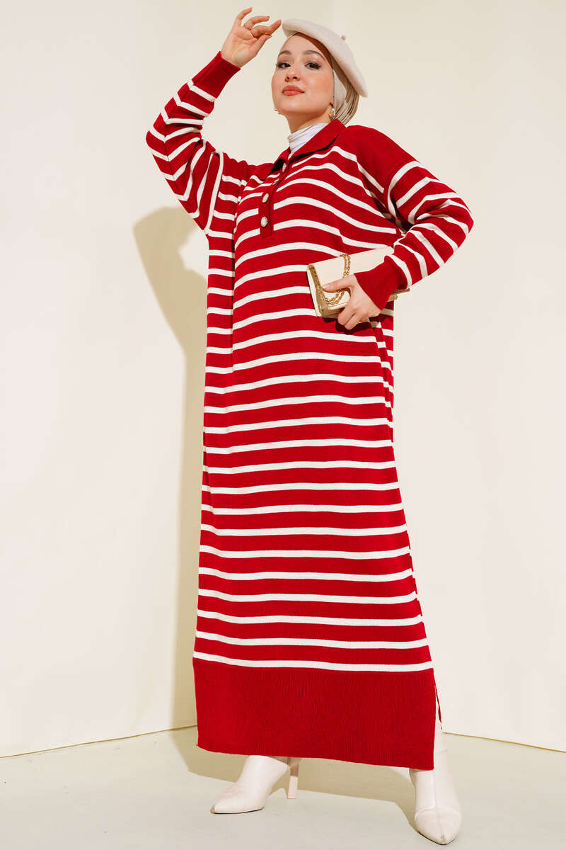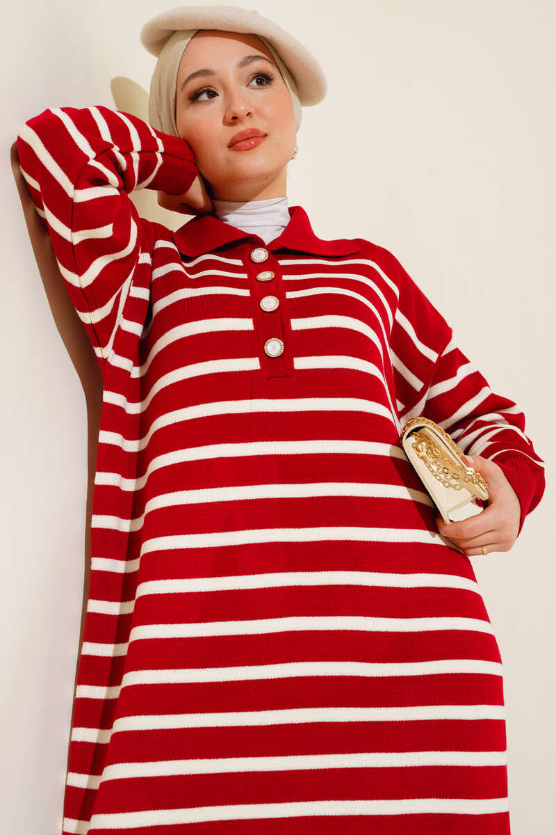 Yeni sezon elbise modelimiz sizlerle beraber. Çizgili model olan elbisemiz trikodur. Yakası taşlı düğmelidir. Düşük omuzludur. Triko elbisemizin renk seçenekleri mevcuttur.