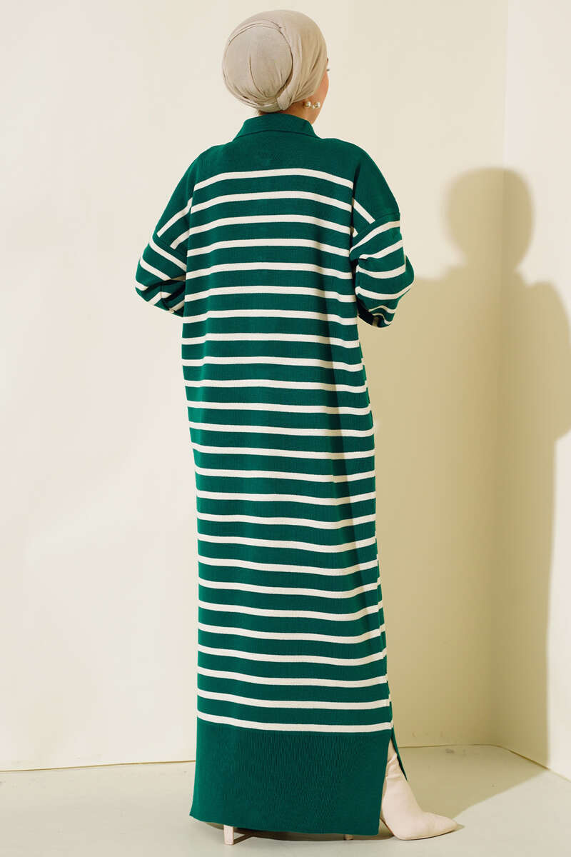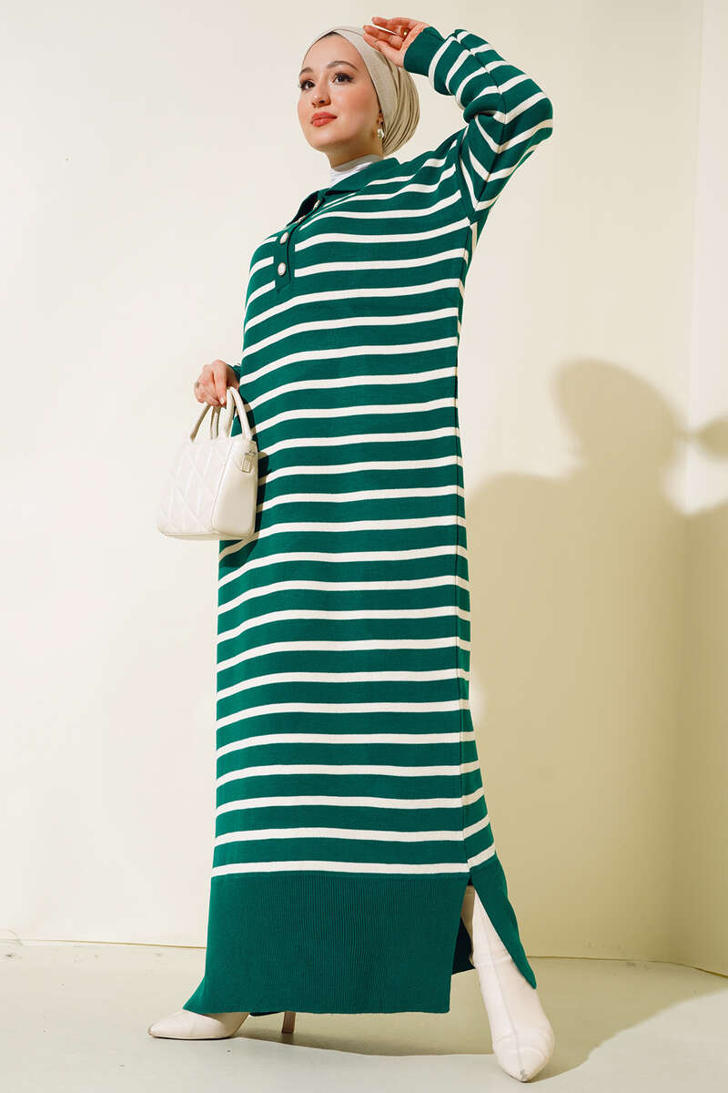 Çizgili Düğmeli Triko Elbise Zümrüt Yeşili